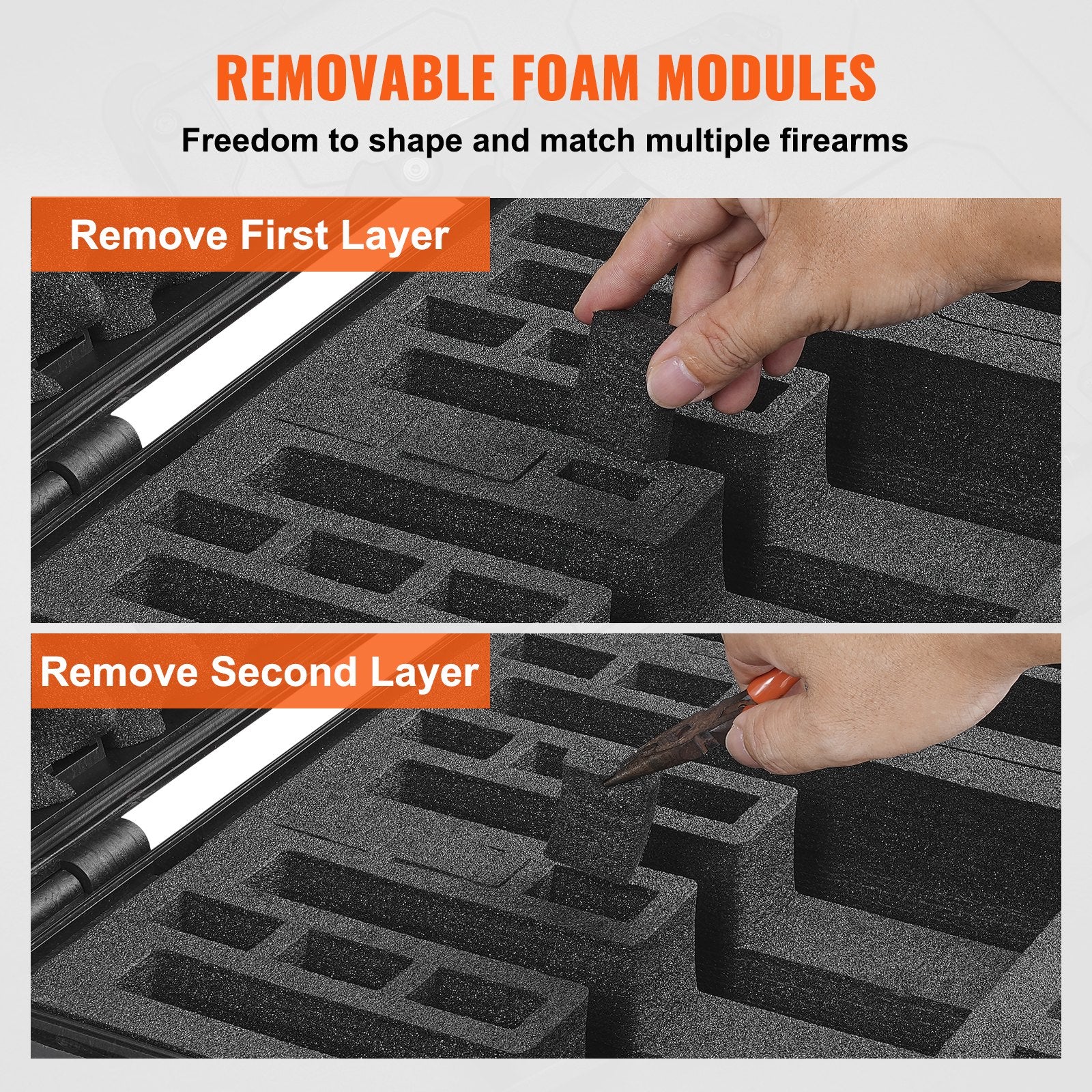 - Versatile XPE Module: To ensure a precise fit with handguns of various sizes, we've integrated height and length adjustable XPE modules. This feature ensures that even the smallest handguns fit snugly like full-sized ones, making it perfect for storing most handgun models and accessories such as goggles, holsters, gloves, and ammunition, offering an ideal storage and travel solution.
