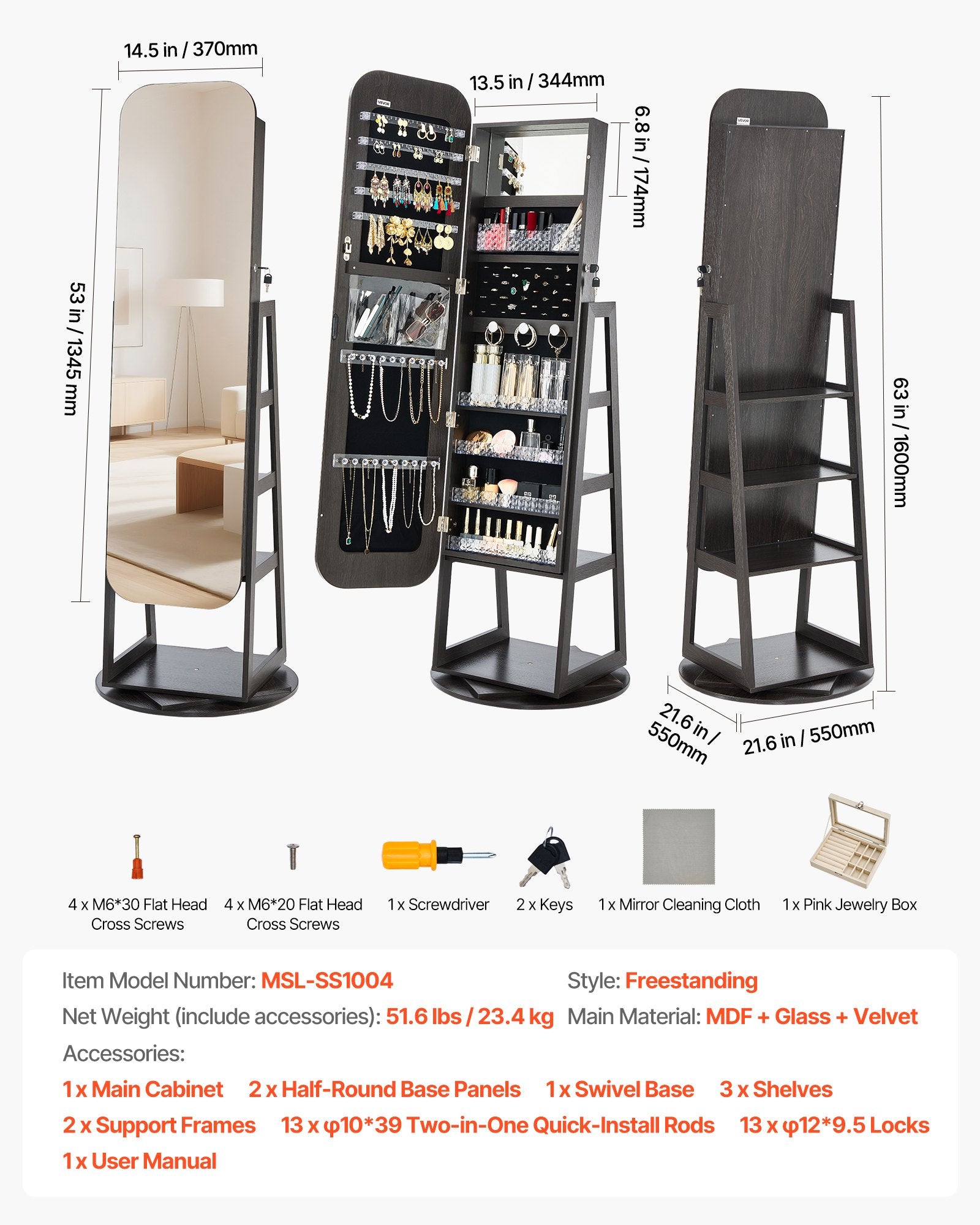 - 3-in-1 Functional Design: Not just a jewelry cabinet—the rotatable jewelry mirror is a full-length mirror with a 360° rotation and internal makeup mirror. Store shoes and bags below for a complete outfit view and get ready confidently for any occasion