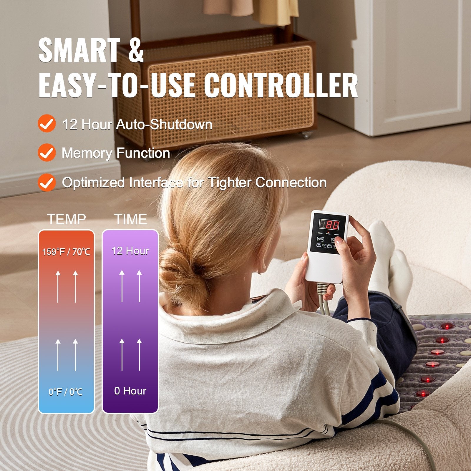 - Easy-to-Use Controller: Customize your heating experience with our user-friendly controller. Set the temperature between 103-159℉ and adjust the timer from 0 to 12 hours to suit your preferences. With a memory function, it retains your last settings, providing safe and convenient use every time.