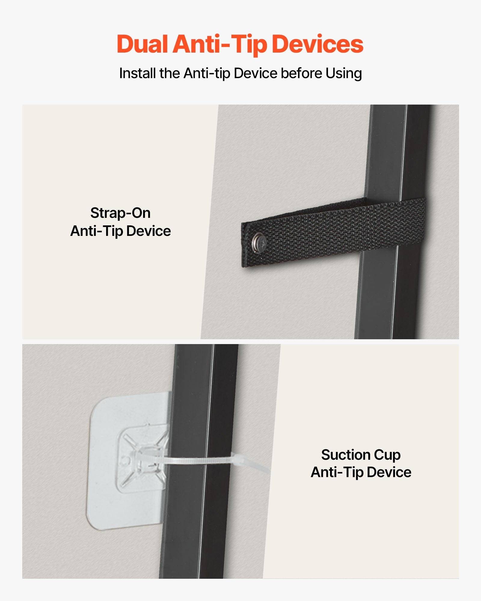 - Anti-Tip Devices: Includes both strap-style and suction cup-style anti-tip devices, which are compatible with various wall types such as tile, wood, and cement. You can choose the most suitable device based on your wall surface to securely fix the shelf. Please ensure the anti-tip devices are installed before use