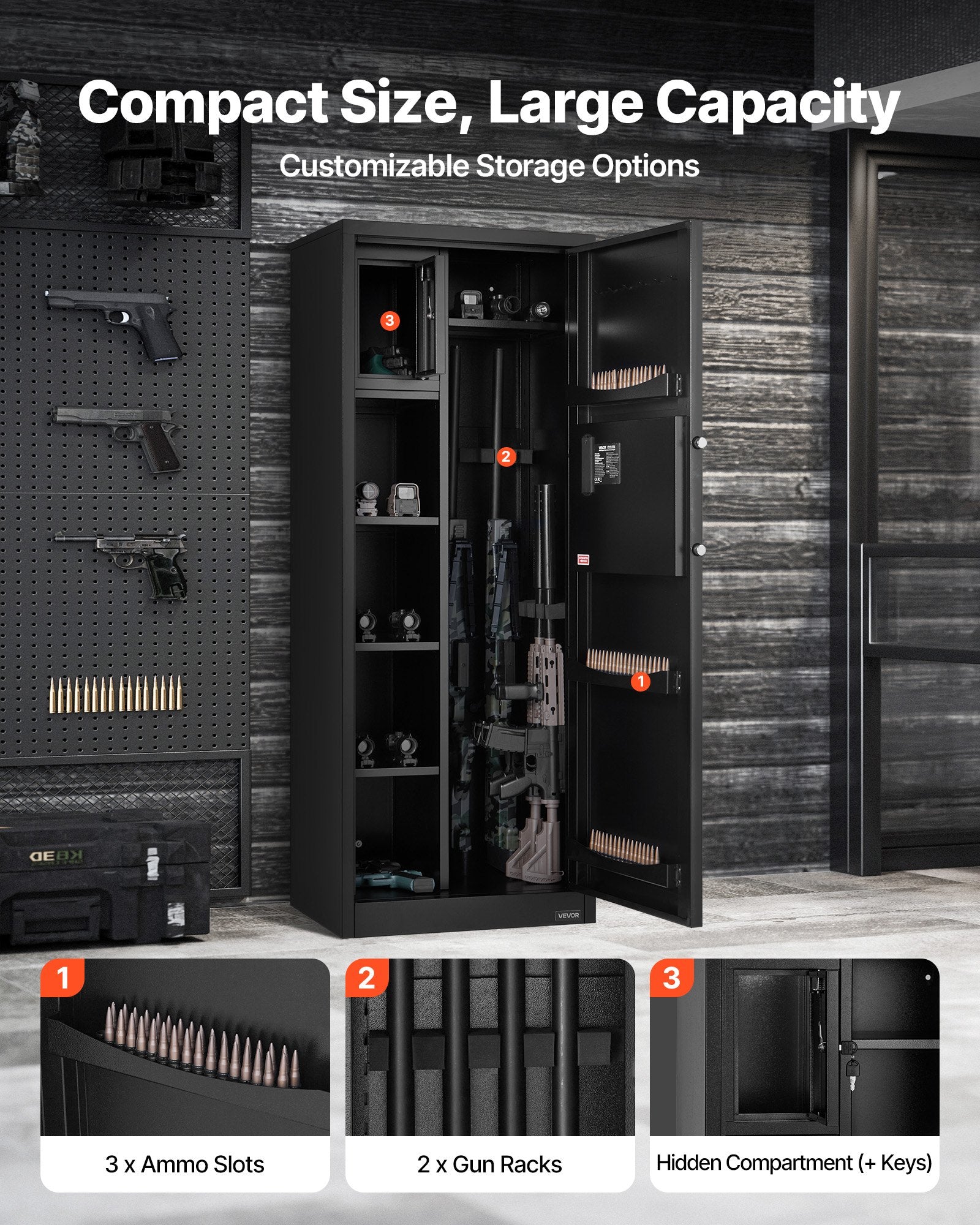 - Large Capacity Safe: This gun safe can hold up to 4 rifles, with 3 ammo slots and 2 adjustable gun racks. It also features a hidden compartment (with a separate key) for storing firearm accessories, ammunition, or other valuable items