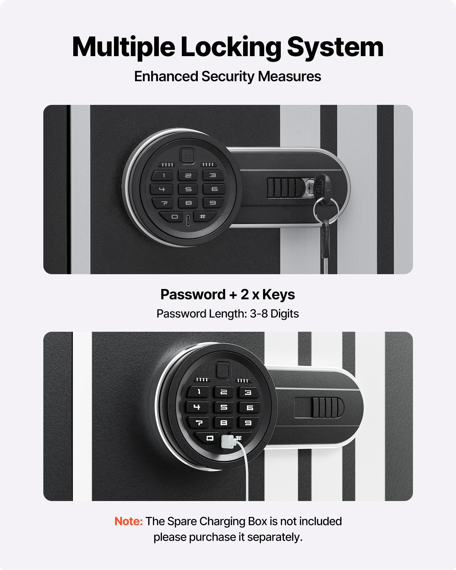 - Smart Lock: The 9-digit touchscreen password lock provides quick access. The password can be set between 3-8 digits, with an auto-lock function for added security. It also includes an emergency key and spare charging box for easy unlocking during battery depletion. (Note: There is no battery inside, you need to buy 4 AA batteries separately.)