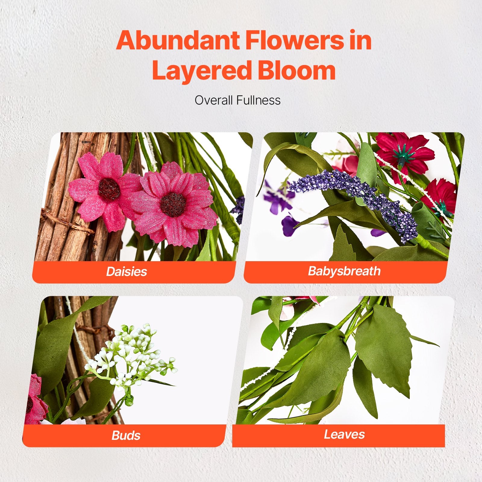 - Premium Silk Fabric: This all-season wreath’s flowers have vibrant, long-lasting colors. The material is durable, easy to clean, and fade-resistant, making it suitable for long-term use. It is soft and realistic in appearance.