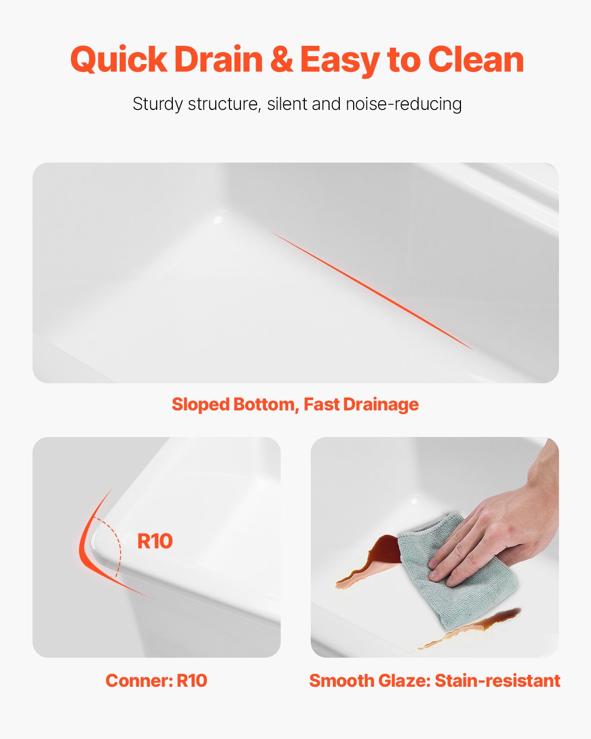 - Durable High-Temperature Material: The farmhouse sink features a heavy-duty fireclay construction with a dual-layer glazed finish, resistant to scratches and fading. The enamel surface withstands heavy tasks. The ultra-smooth surface is easy to clean