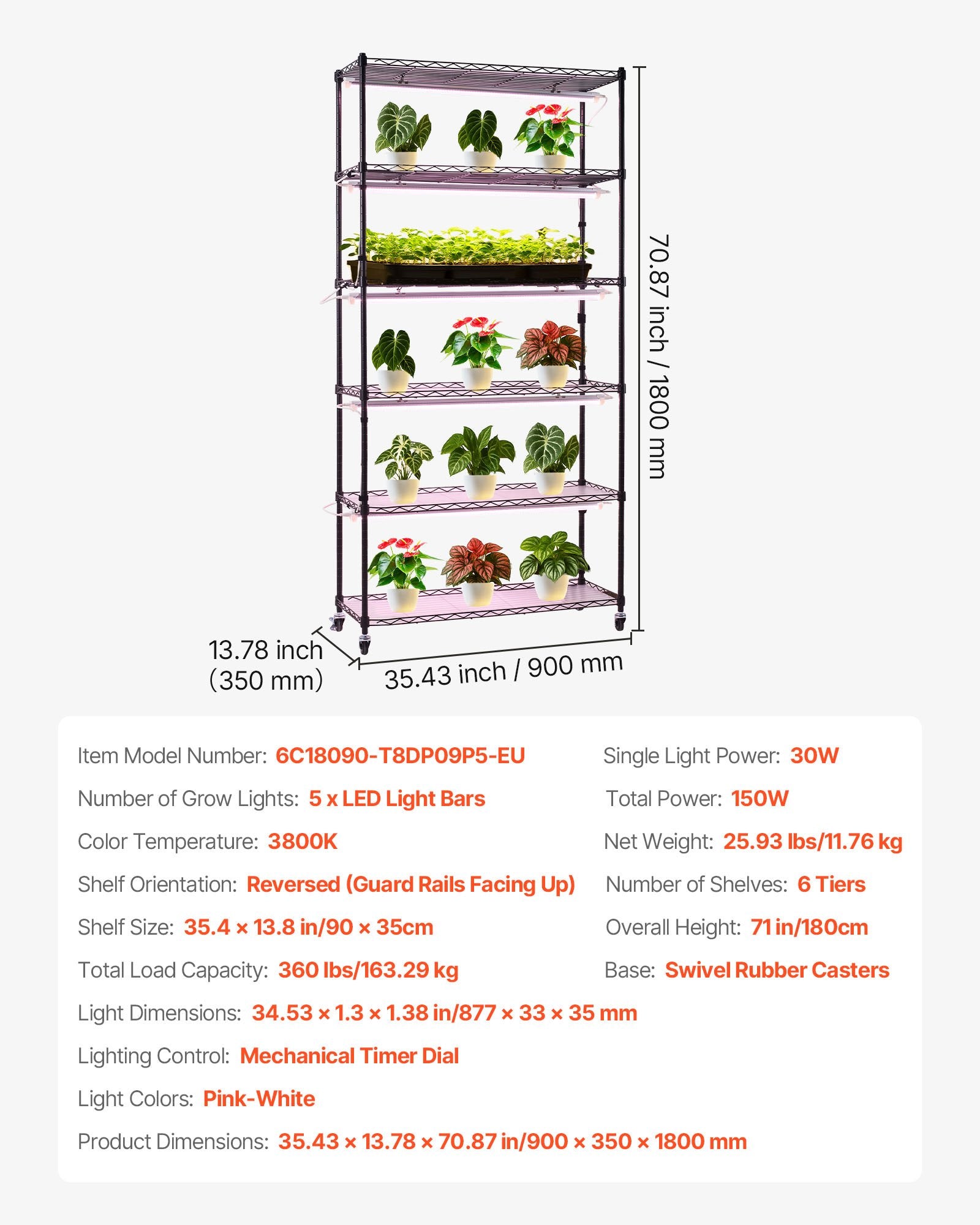 Plant Shelf with Grow Light, 6-Tier Indoor Plant Stand, 180cm Tall Indoor Plants Display Rack with Wheels & Timer, 150W 3800K Full Spectrum Grow Lights, Metal Flower Pot Holder for Seed Starting