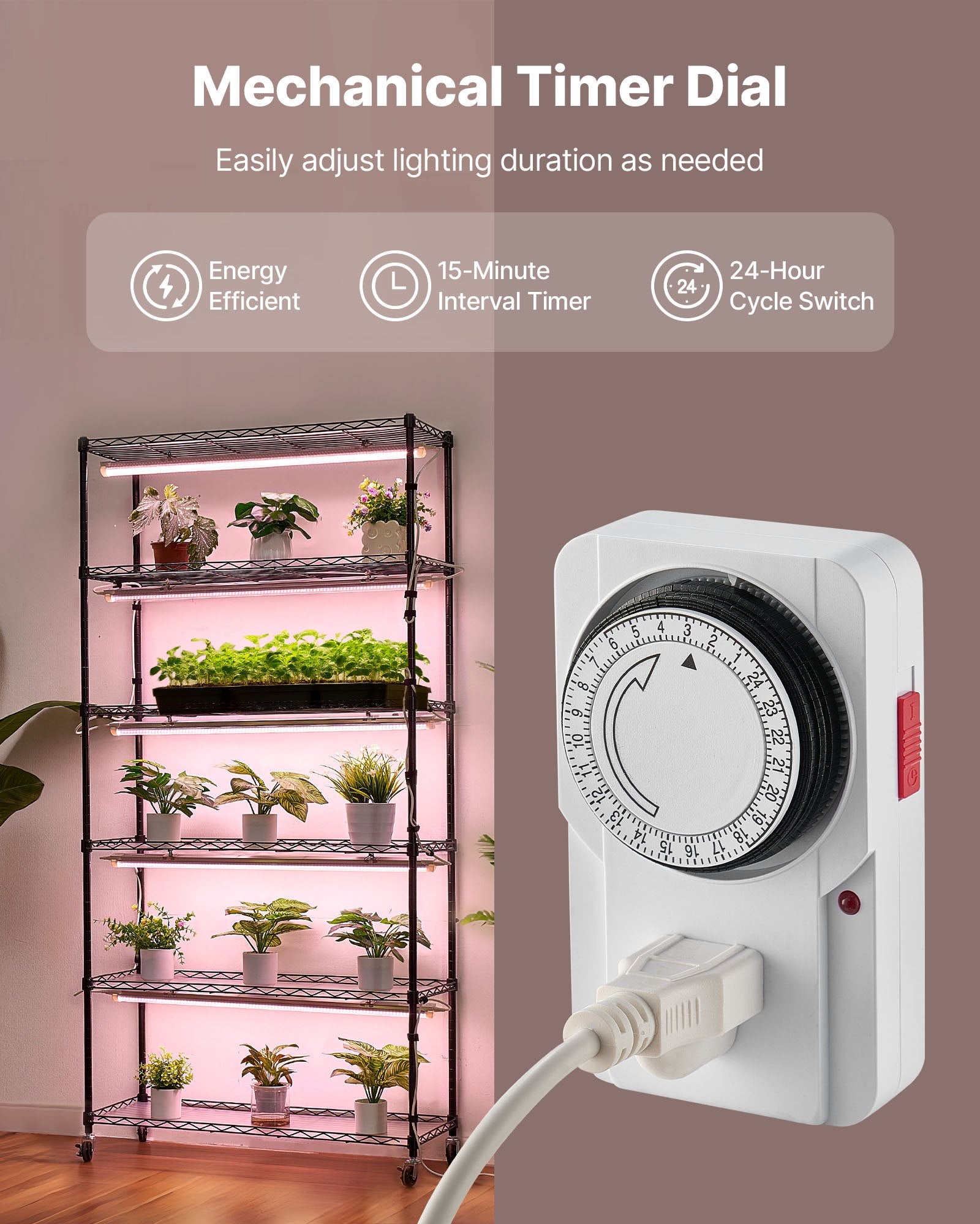 - Mechanical Timer: The indoor plant stand with grow light features built-in 24-hour programmable timer with 15-minute intervals for easy operation. Set once for daily automatic on/off, ensuring plants receive consistent, energy-efficient lighting cycles.