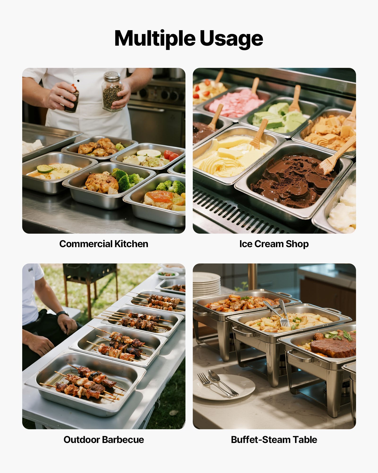- Genomtänkt design: Denna matform i rostfritt stål är perfekt för bröllop, fester, restauranger och hotell. Oavsett om du lagar mat för en stor familj eller driver ett livsmedelsföretag, uppfyller multipacket ett brett utbud av matlagnings- och serveringsbehov.