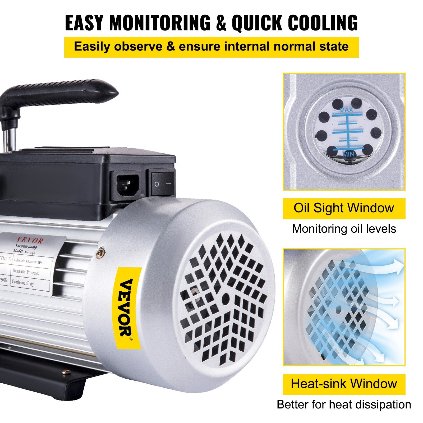 - Easy Monitoring & Cooling: With an oil viewing window, this AC vacuum pump can easily monitor oil levels to avoid oil deficiency. Our vacuum pump tool can cool itself and prevent itself from burning out. The built-in thermal protection prevents the machine from burning and extend the machine's life.