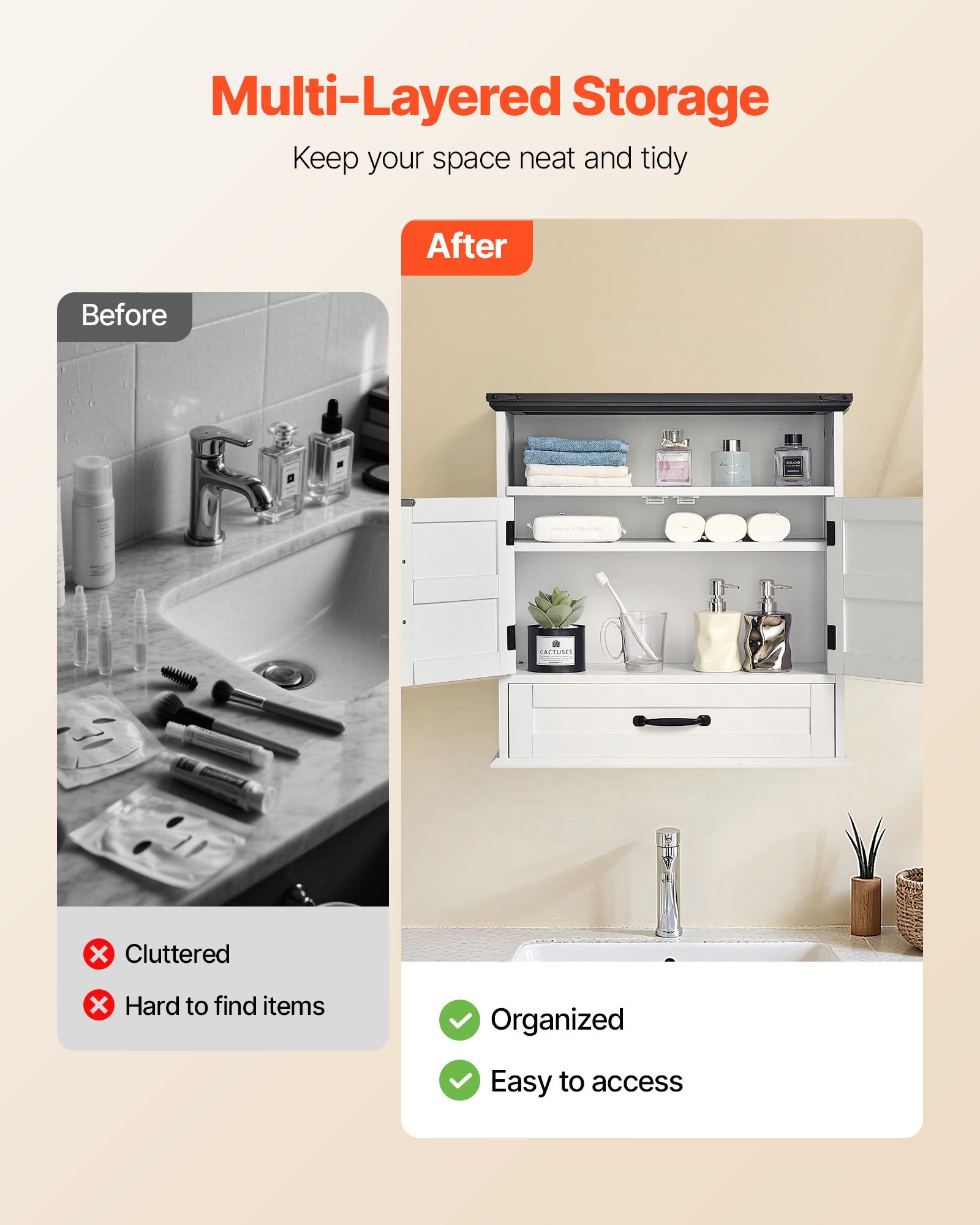 - Lätt att installera: Detta badrumsskåp har en väggmonterad design och levereras med en komplett uppsättning installationsverktyg och detaljerade instruktioner. Inga professionella färdigheter eller extra verktyg behövs – nybörjare kan snabbt slutföra monteringen.