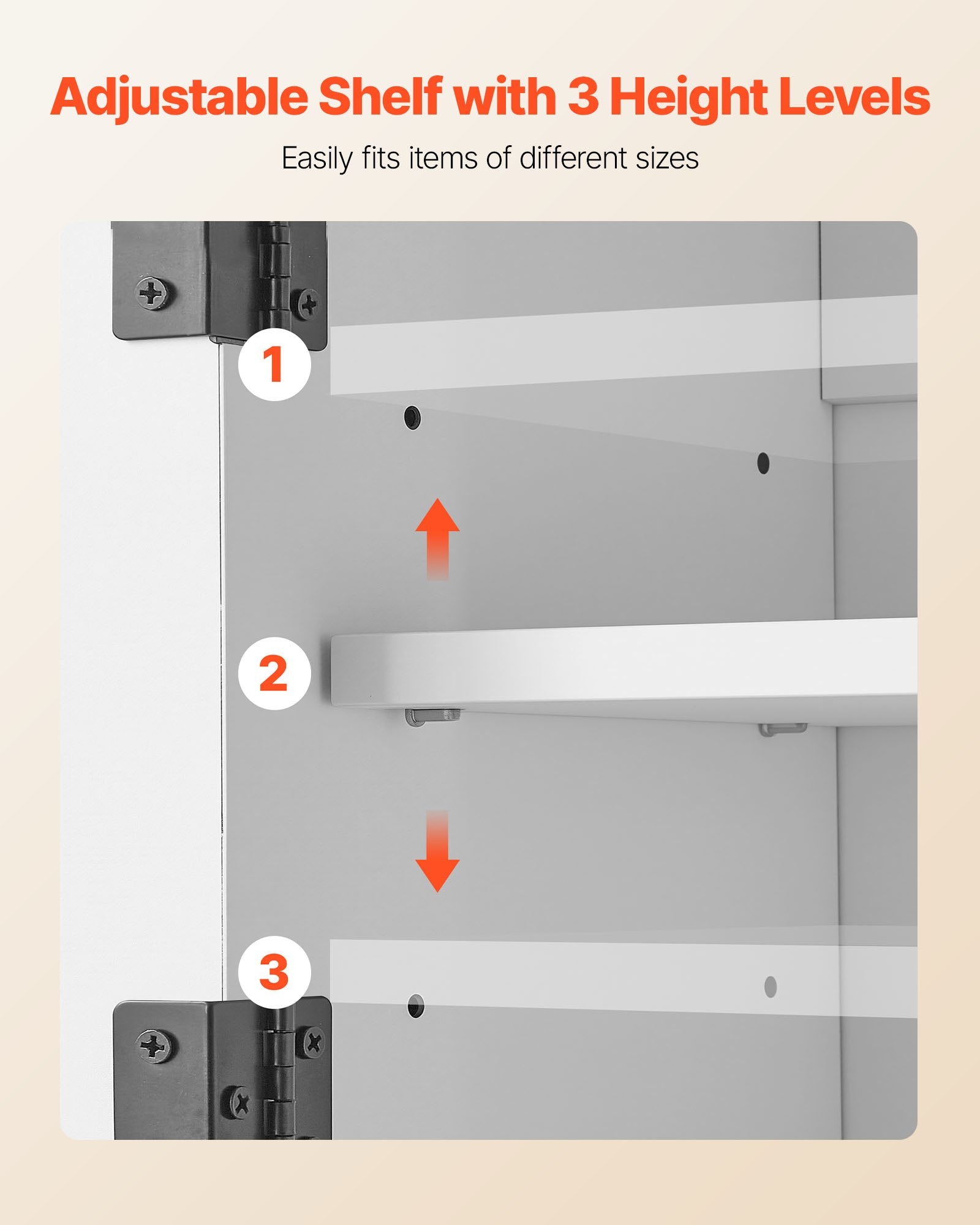 - Justerbar hylla: Det väggmonterade badrumsskåpet har en justerbar hylla med 3 höjdnivåer, utformad för att fritt kunna anpassas till föremål med olika höjder. Flexibel layout uppfyller olika förvaringsbehov och maximerar utnyttjandet av badrumsutrymmet.