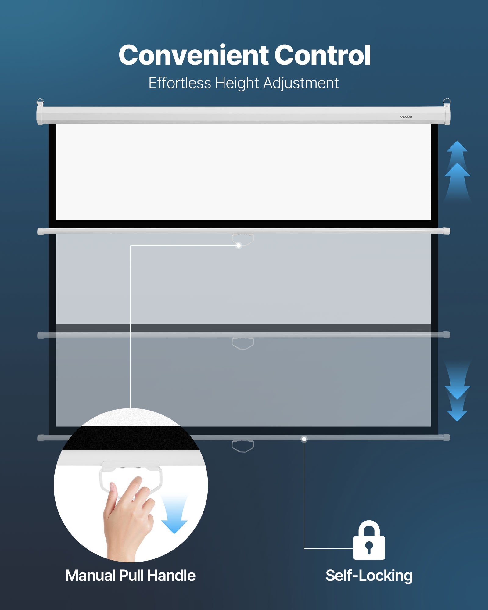 - Enkel manuell kontroll: För de som föredrar en praktisk metod har den manuella projektorduken ett manuellt draghandtag, vilket gör att du enkelt kan justera skärmen till önskad höjd. Skärmen låses automatiskt på plats för extra bekvämlighet
