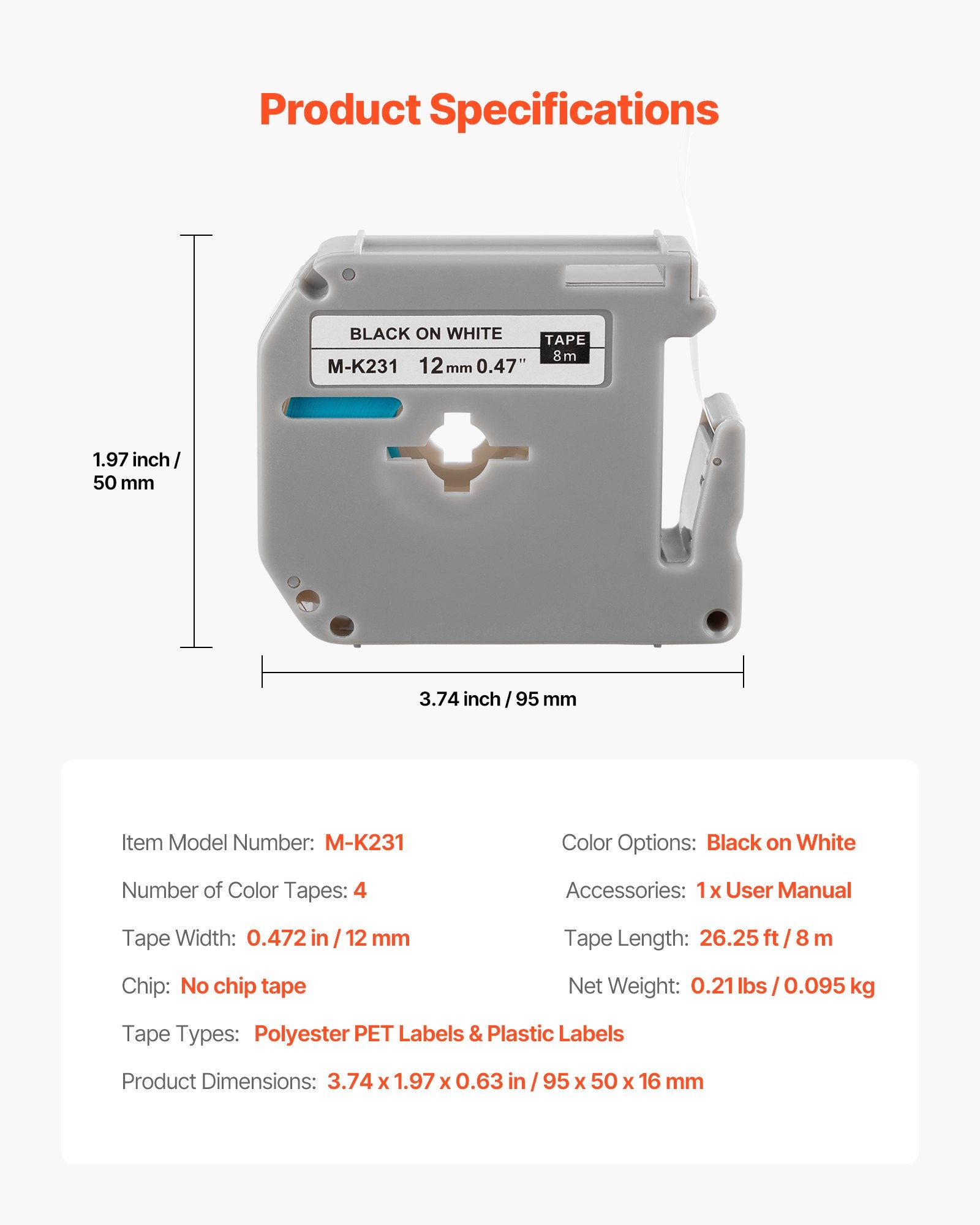- Tape Width: 0.472 in / 12 mm