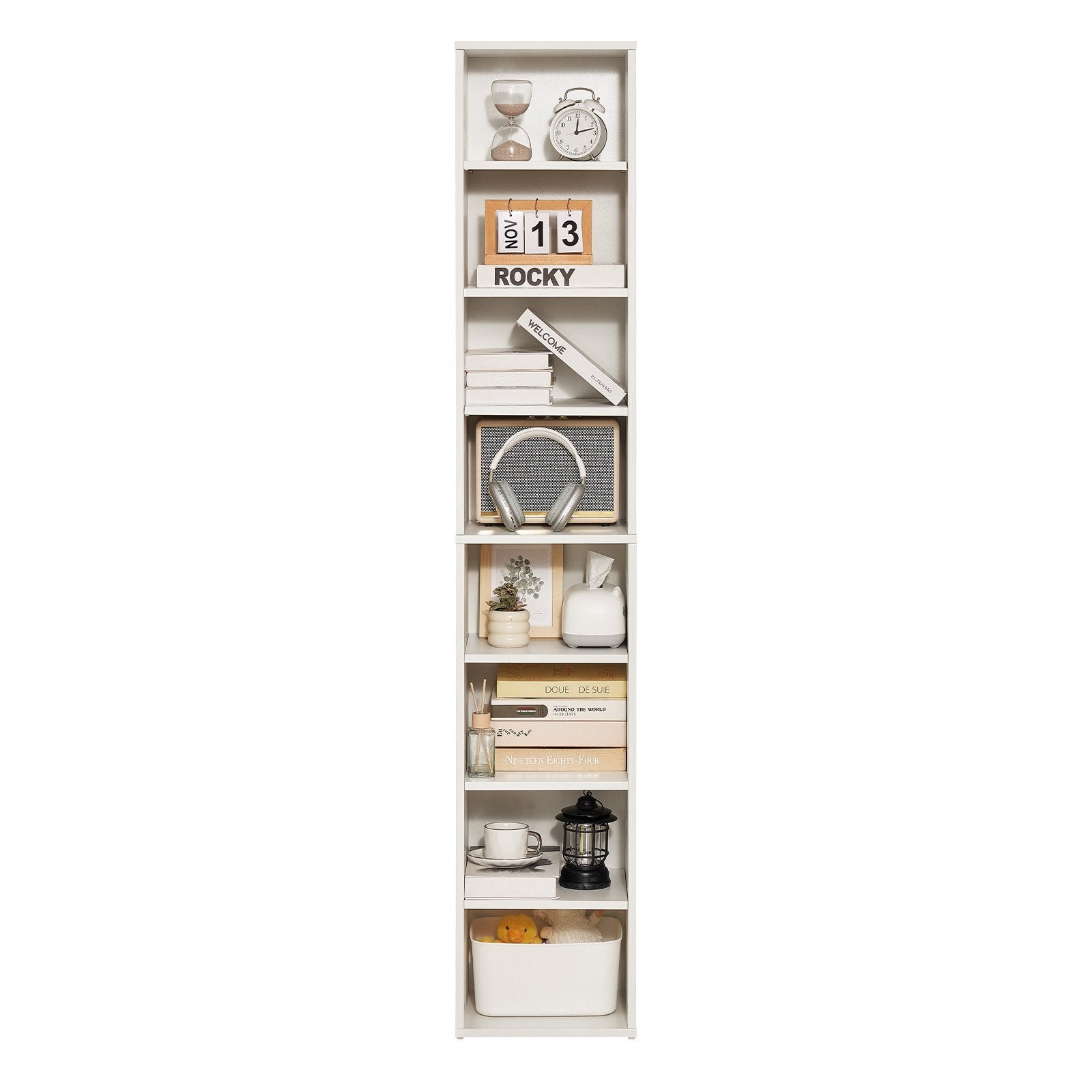 8 våningar smal bokhylla, 71 tum hög öppen bokhylla i trä med höjdjusterbar hylla, fristående displayförvaring golvbokhylla bokhylla för bibliotek, sovrum, vardagsrum, kontor, vit