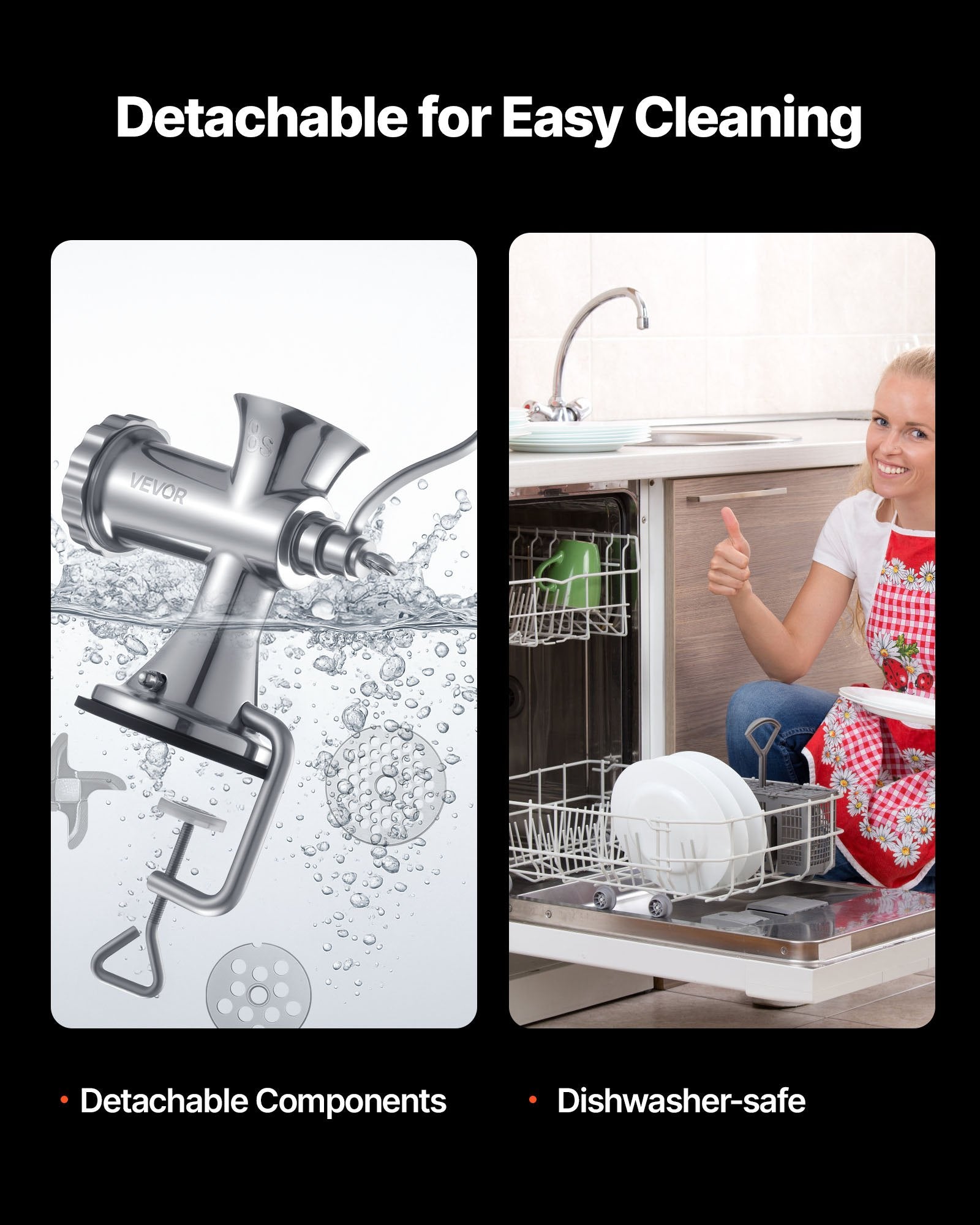 - En köttkvarn, oändliga användningsområden: VEVOR multifunktionella manuella köttkvarn möjliggör enkel malning av grönsaker och kött för att göra köttbullar, kakor, korvar och mer. Den levereras också med 5 mm och 8 mm skärplattor, 1 skärblad, 1 korvrör i rostfritt stål, 1 kaktillbehör, 1 malhuvud och köttpåskjutare, vilket tillgodoser de olika behoven hos olika kulinariska skapelser.