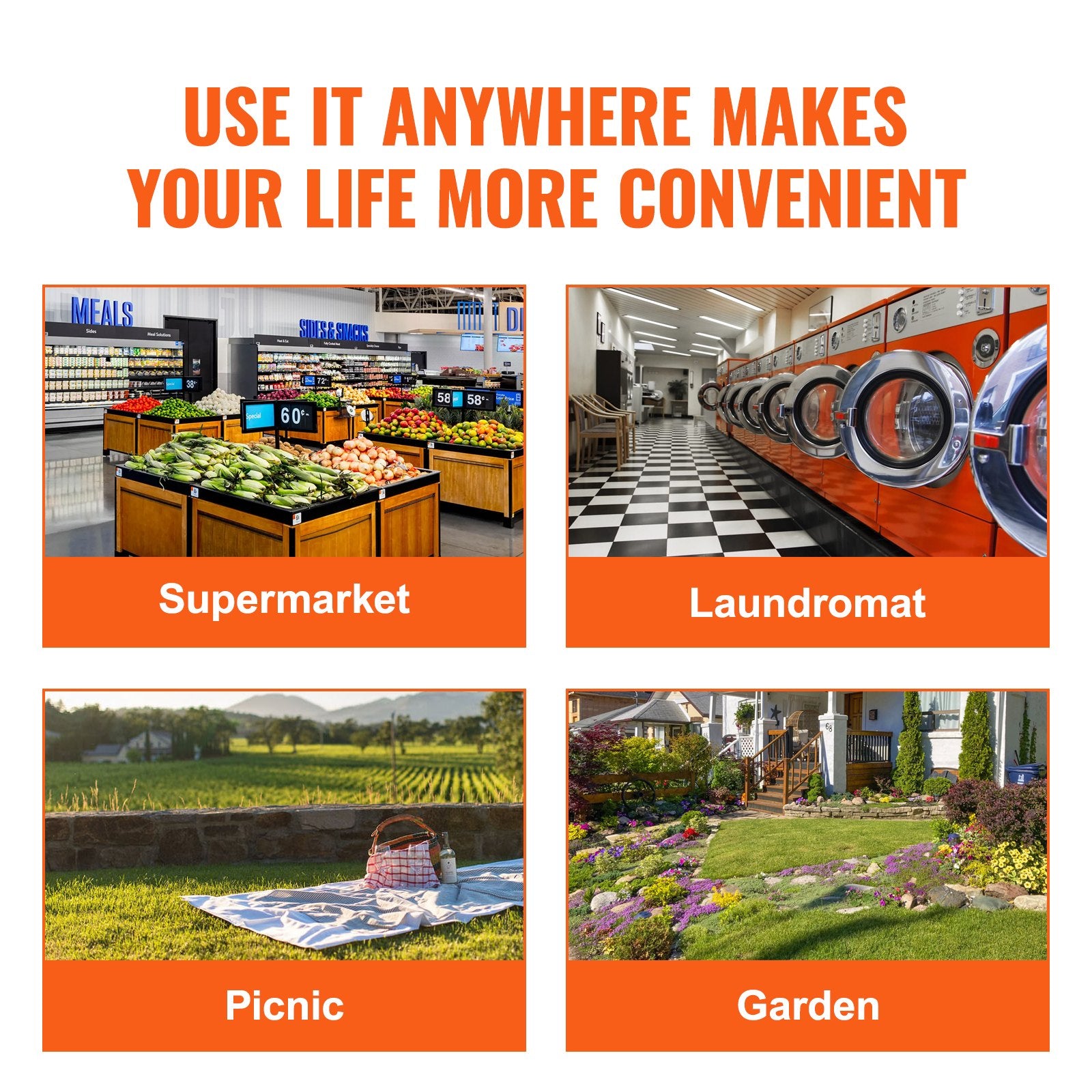 - Design med överdimensionerade hjul: Denna matvagn rullar på två ultratysta gummihjul med en diameter på 70 mm och glider som en dröm. Ställ den upprätt för att låsa den på plats – ingen glidning, inget krångel. Från krappa och snöiga vägar till kullerstensvägar har denna vagn flexibiliteten att ta sig vart du än vill utan ansträngning.