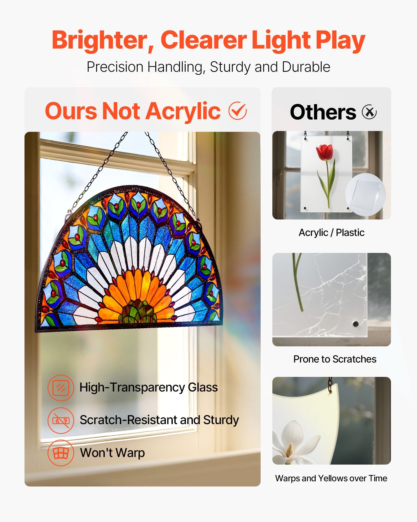 - Premiumglasmaterial: Denna glasmålningspanel för fönster är tillverkad av högkvalitativt glas istället för plast och ger utmärkt ljusgenomsläpp, vilket skapar drömska färgreflektioner. Den behåller sin form och klarhet över tid.