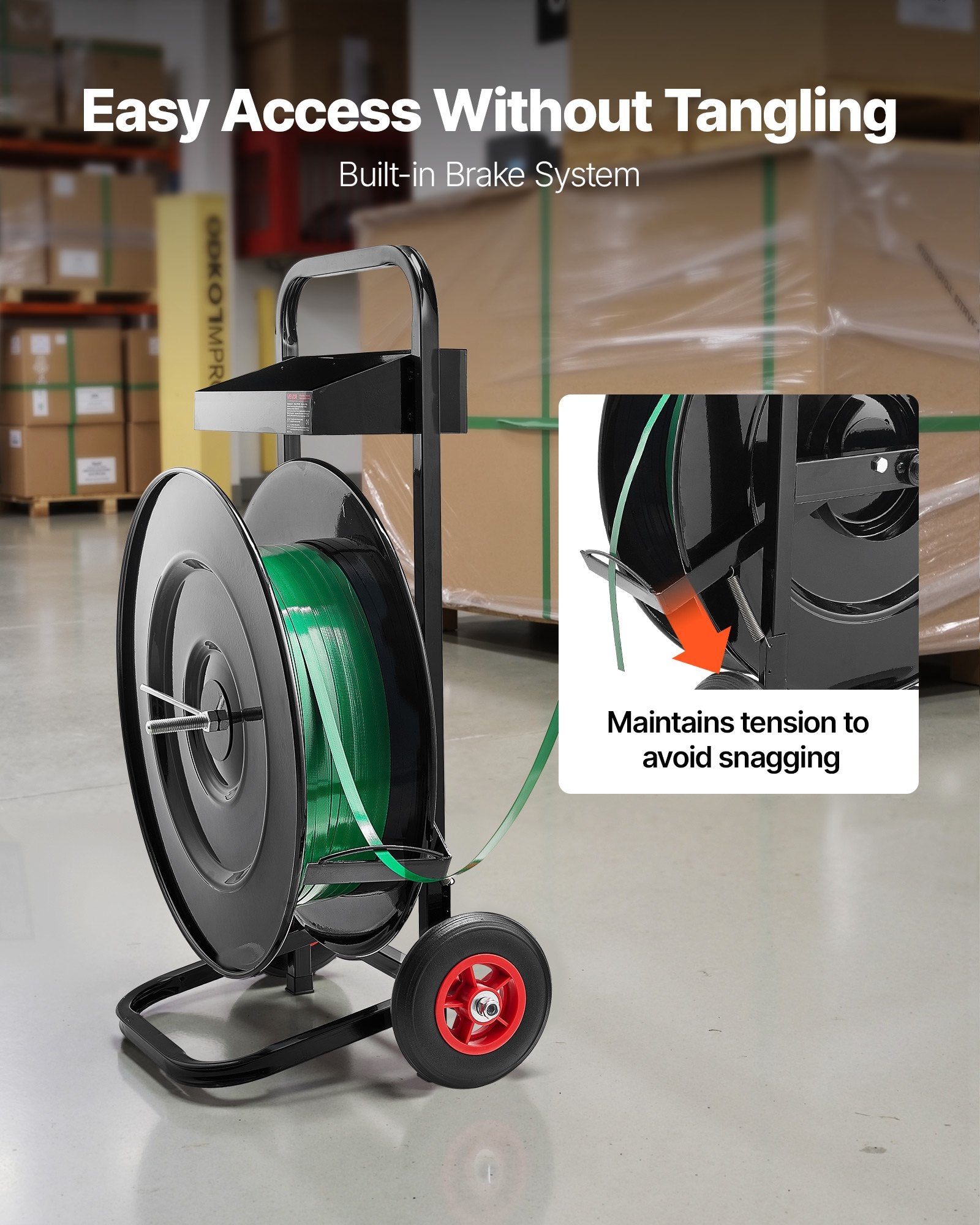 Bandvagn, lämplig för PET/PP/polyesterbandningsrullar med kärnstorlek 20,3/40,6 cm, kraftig bandningsdispenser utrustad med uppgraderat bromssystem, inbyggt rymligt verktygsfack