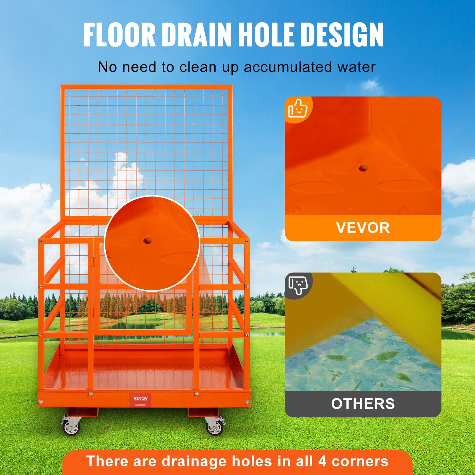 - Design utan bekymmer: Förvandla din gaffeltruck till en mångsidig arbetsstation med lätthet! Placera bara arbetsplattformen på gaffeltrucken, skjut gaffeln över hylsan och fäst dem på plats, så är plattformen redo att användas. Dessutom finns det ingen anledning att oroa sig för att vatten samlas på regniga dagar. Den är utrustad med dräneringshål för att underlätta rengöring och dränering av dammar.