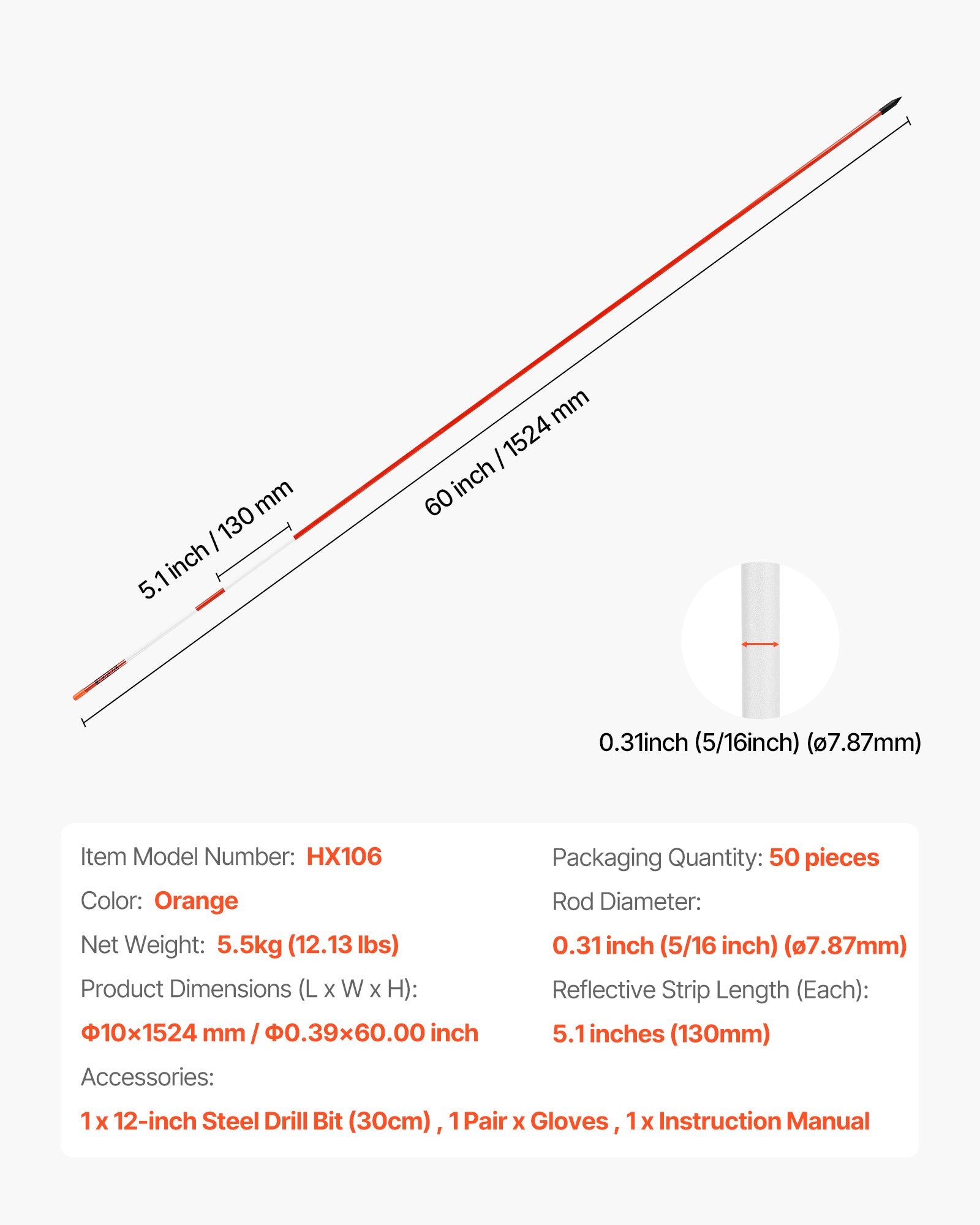 Uppfartsmarkörer, 50 st. 152 cm långa, 7,87 mm diameter, hög synlighet för uppfarter med 12-tums stålborr, reflekterande snöpinnar, glasfiberstång för parkeringsplatser, gångvägar, snöröjning