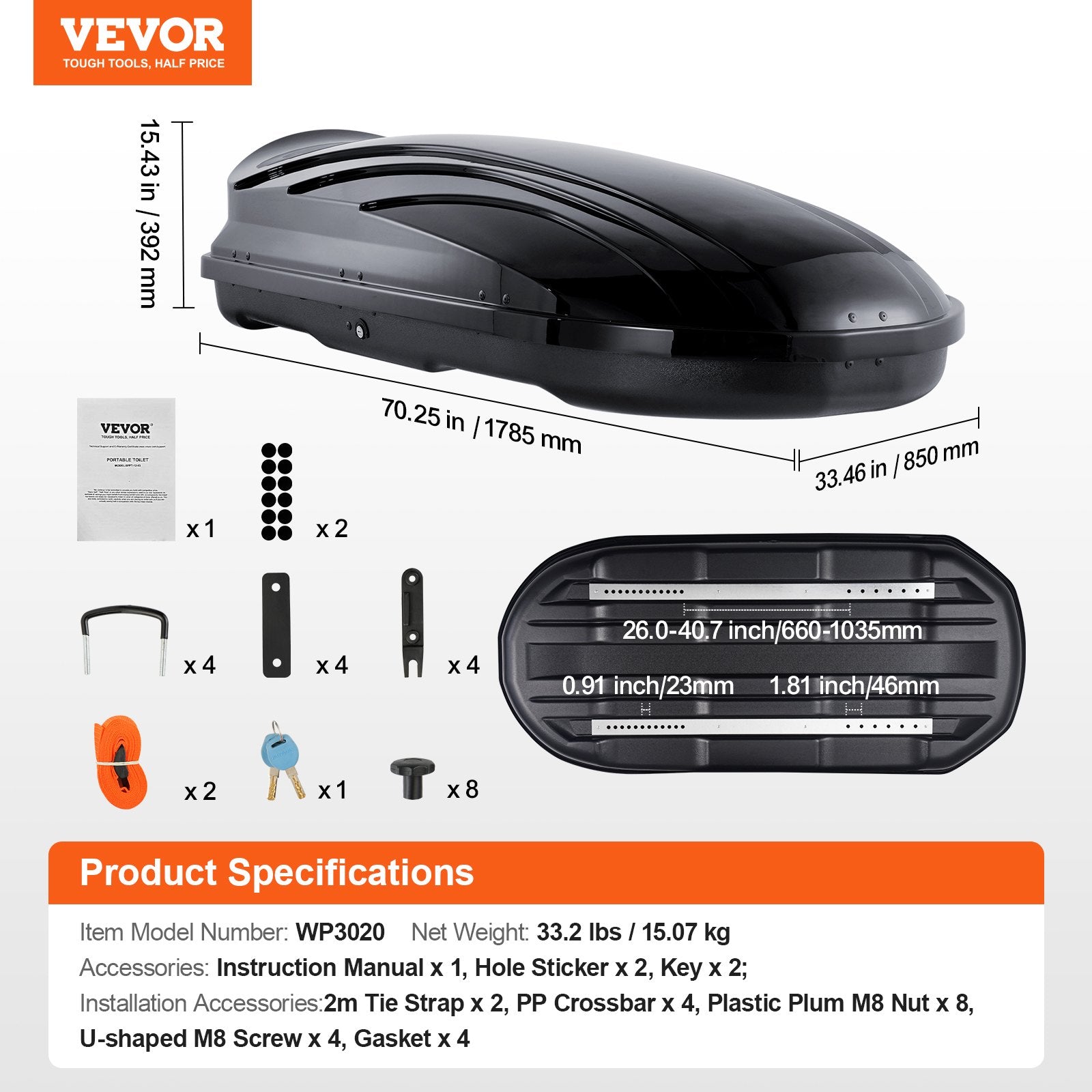 - Kompatibel med olika tvärbalkar: Passar tvärbalkar med ett centrumavstånd på 29,6–37,1 tum / 752–943 mm. Inkluderar kompletta installationsverktyg, ingen borrning krävs. Har metallstänger i botten för ökad stabilitet.