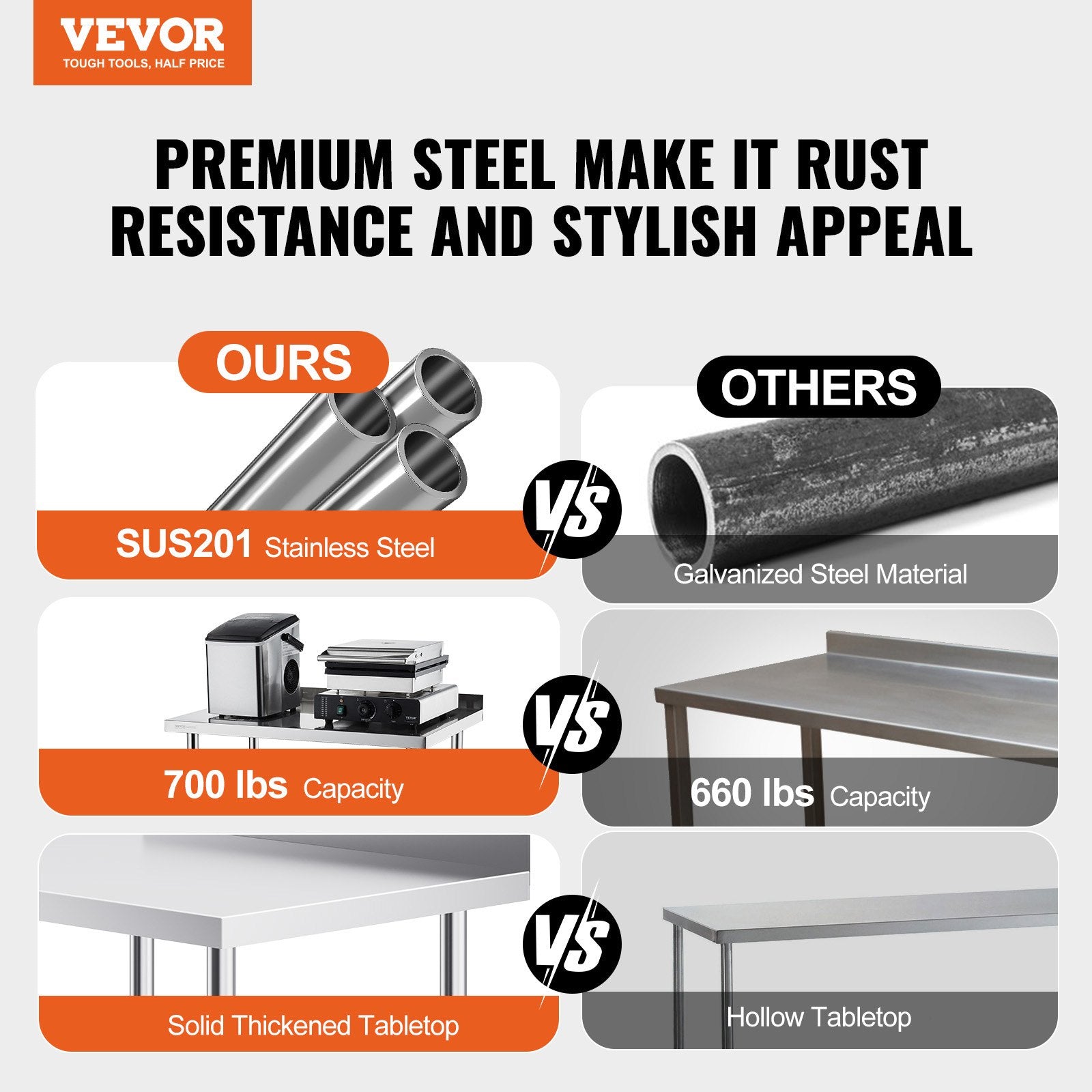 - Högkvalitativt rostfritt stål: Detta arbetsbord, som mäter 61 x 76 x 101 cm, är tillverkat av SUS201 rostfritt stål för bordsskiva, hyllor och ben. Det erbjuder överlägsen rostbeständighet, ett elegant utseende och en slät yta som är lätt att rengöra med en enkel torkning. NSF-certifierat, uppfyller det strikta folkhälsostandarder, vilket garanterar ett långvarigt skydd för din hälsa.
