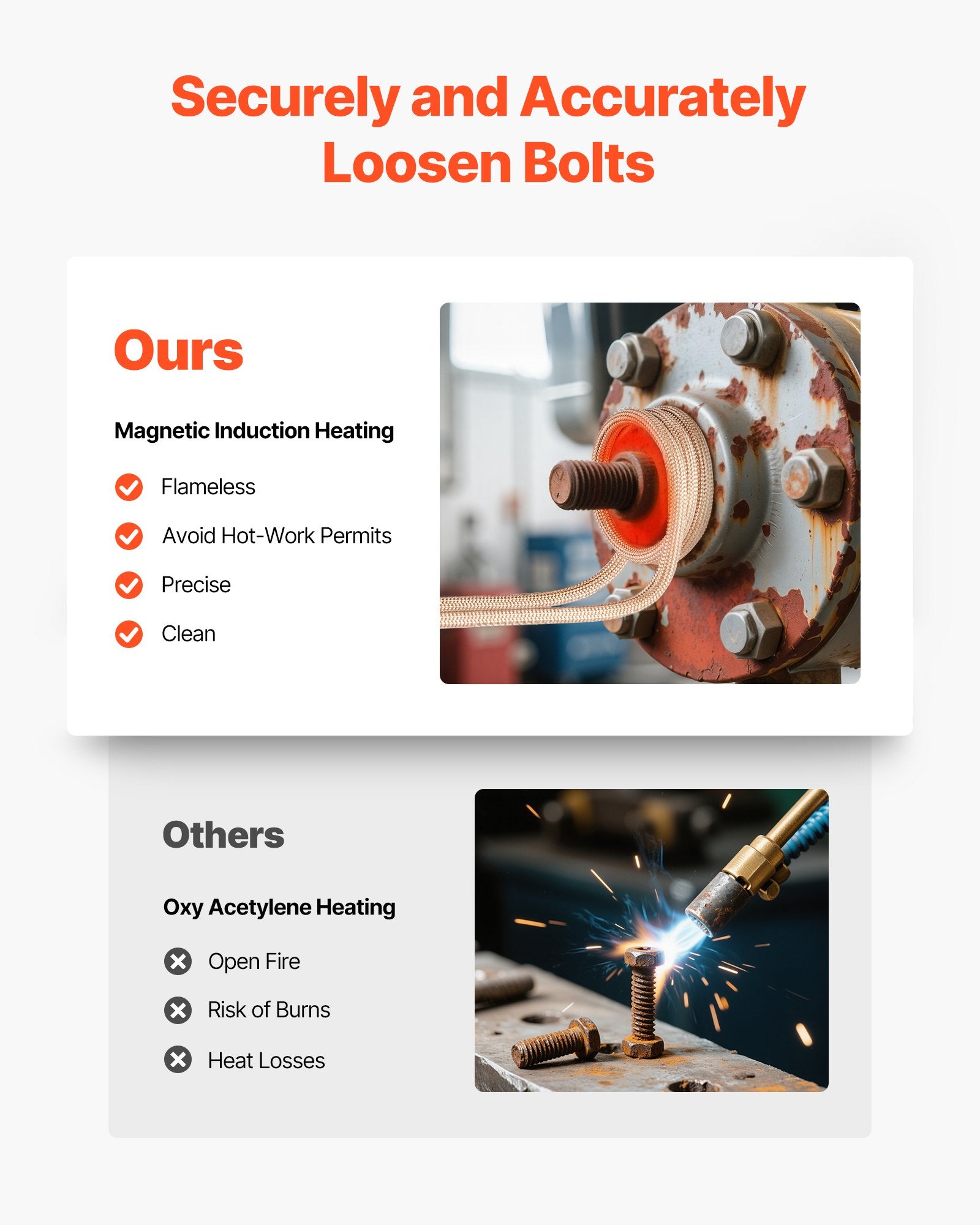 - Wide Application: This bolt heater tool is suitable for use in automotive repair and mechanical maintenance. It is ideal for heating stuck, rusted, or frozen bolts, screws, bearings, gears, and small metal parts, including frozen lathe fasteners