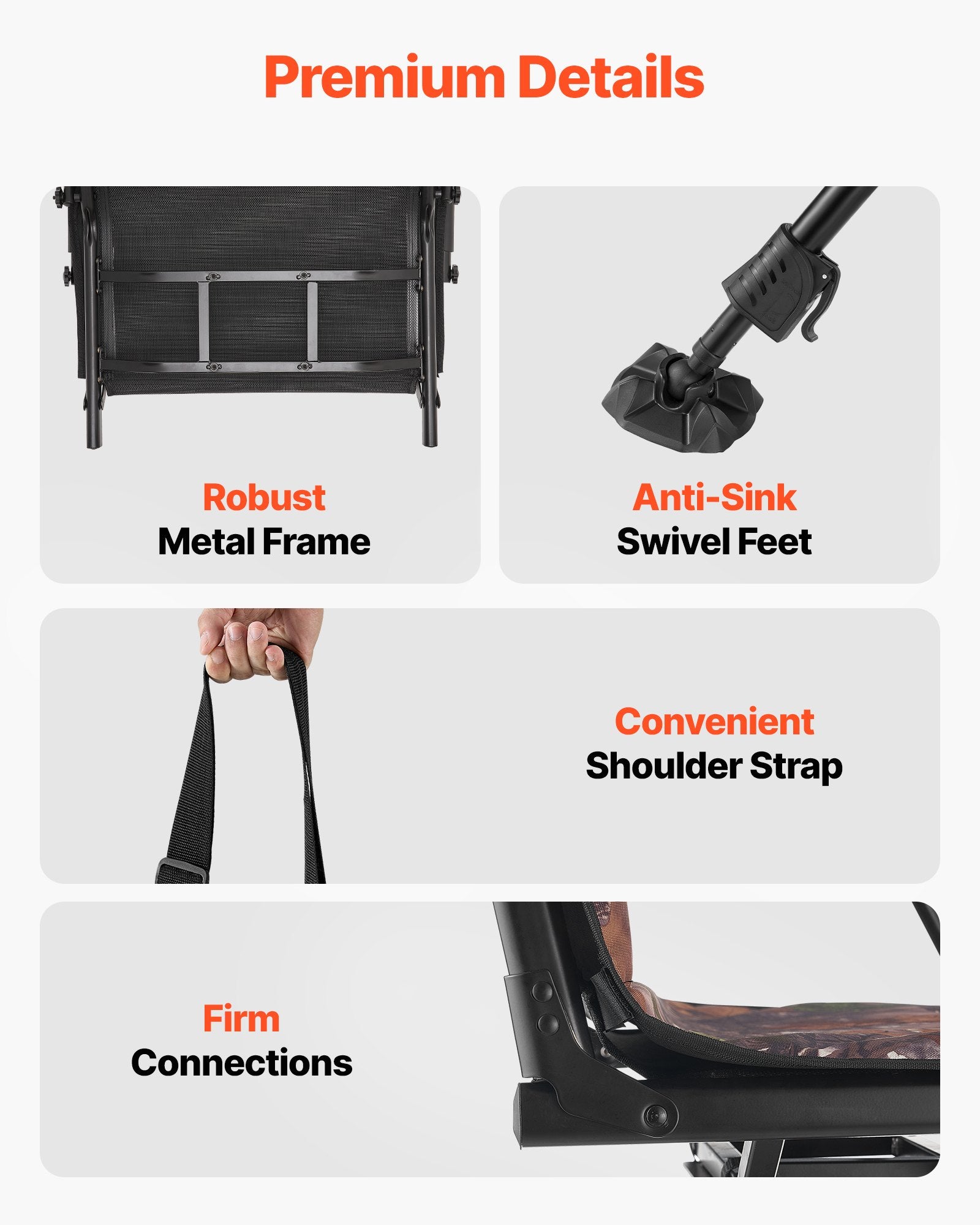 - Byggd för komfort hela dagen: Denna ergonomiska jaktstol har en sits med en maxstorlek på 570 x 500 x 1080 mm (880 mm). Dess robusta konstruktion stöder upp till 158 kg, med lättrengjort avtagbart kuddfodral.