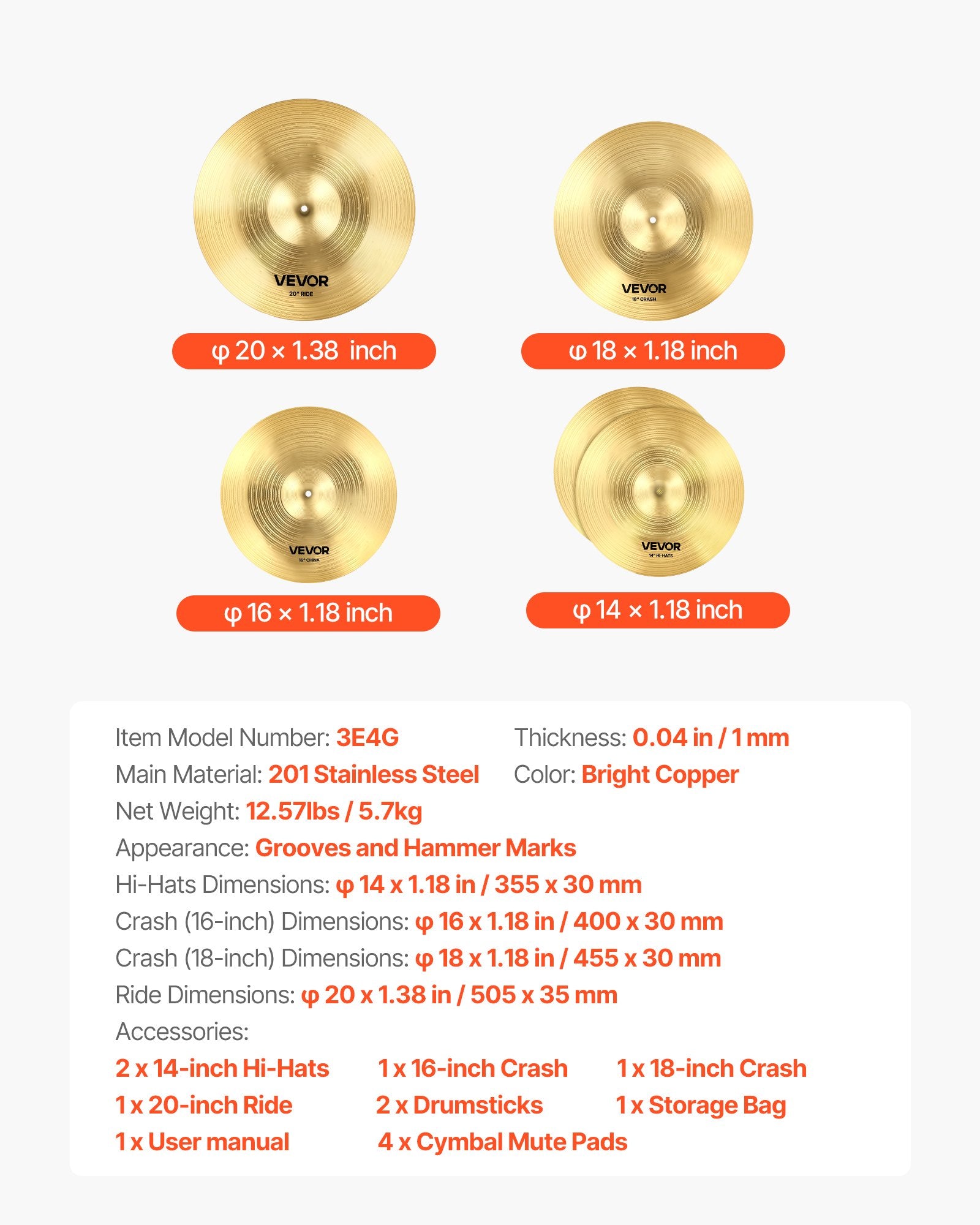 - Cymbalset i flera delar: Detta cymbalset innehåller 14-tums hi-hats, 16-tums crash, 18-tums crash och 20-tums ride, vilket ger mångsidiga ljud för alla dina musikaliska behov. Perfekt för jazz, rock eller pop, passar alla stilar.
