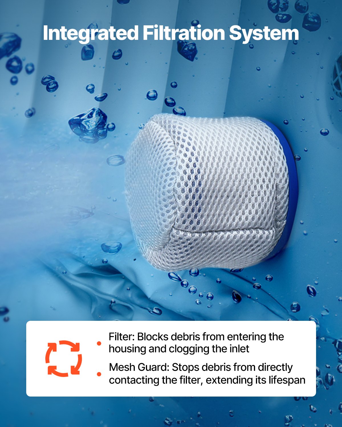 - Integrerat filtreringssystem: Den portabla bubbelpoolen har ett integrerat filtreringssystem som effektivt avlägsnar orenheter, smuts, hudflagor, kosmetikarester och andra föroreningar från vattnet, vilket säkerställer klart och rent vatten samtidigt som det undviker att skräp kommer in i basen och förbättrar hållbarheten.