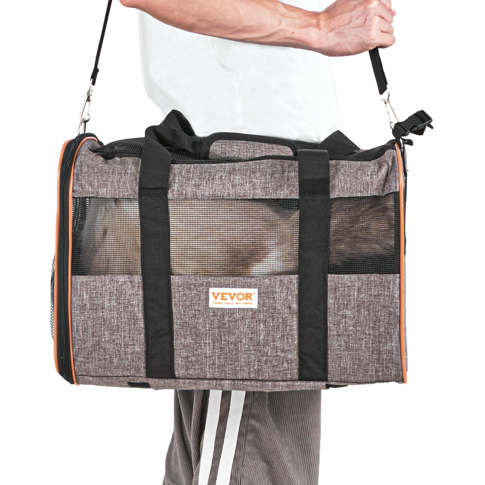 - Bekväm och andningsbar: Vår husdjursbur är designad med 5 andningsbara nätfönster och ger utmärkt ventilation och en bred sikt. Rygg- och axelremmarna har tjock vaddering för extra komfort under långa resor. Den lilla sidofickan kan användas för att förvara husdjurstillbehör och en skål, så att du kan förvara ditt husdjurs mat när du är på språng.