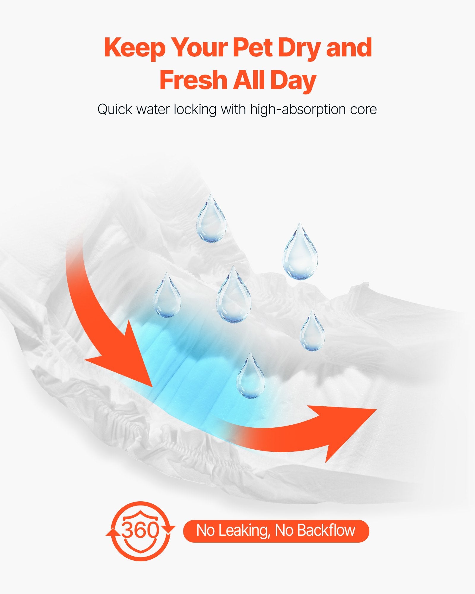 - Superabsorberande: VEVOR engångsblöjor för hanhundar i S-storlek har en superabsorberande kärna som snabbt låser in vätska och erbjuder 360° läckagesäkert skydd utan återflöde. Perfekt för hundar i löpcykler, husdjursträning, inkontinens, återhämtning efter operation och resor. Lämplig midjemått: 12-19 tum / 30,48 - 48,26 cm