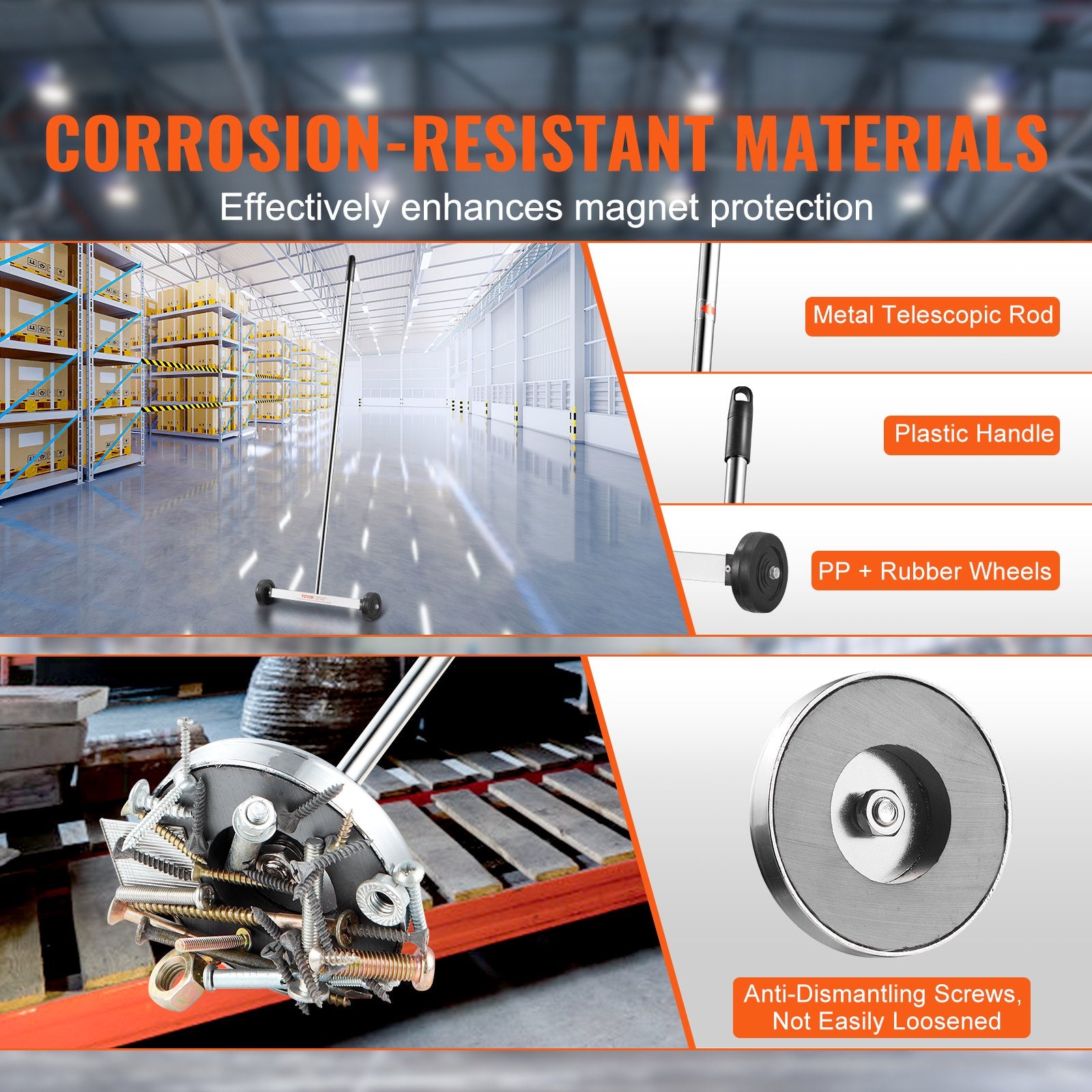 - Överlägsen magnetisk kraft: VEVOR magnetiska sopmaskin med hjul inkluderar en 15-tums magnetisk sopmaskin med hjul och ett 3,2-tums teleskopiskt magnetiskt uppsamlingsverktyg, som kan hålla upp till 8 lbs (15 tum) respektive 35 lbs (3,2 tum). Den samlar enkelt upp spikar, skruvar och svartmetallskräp och skyddar dig från skärvor och vassa metaller.