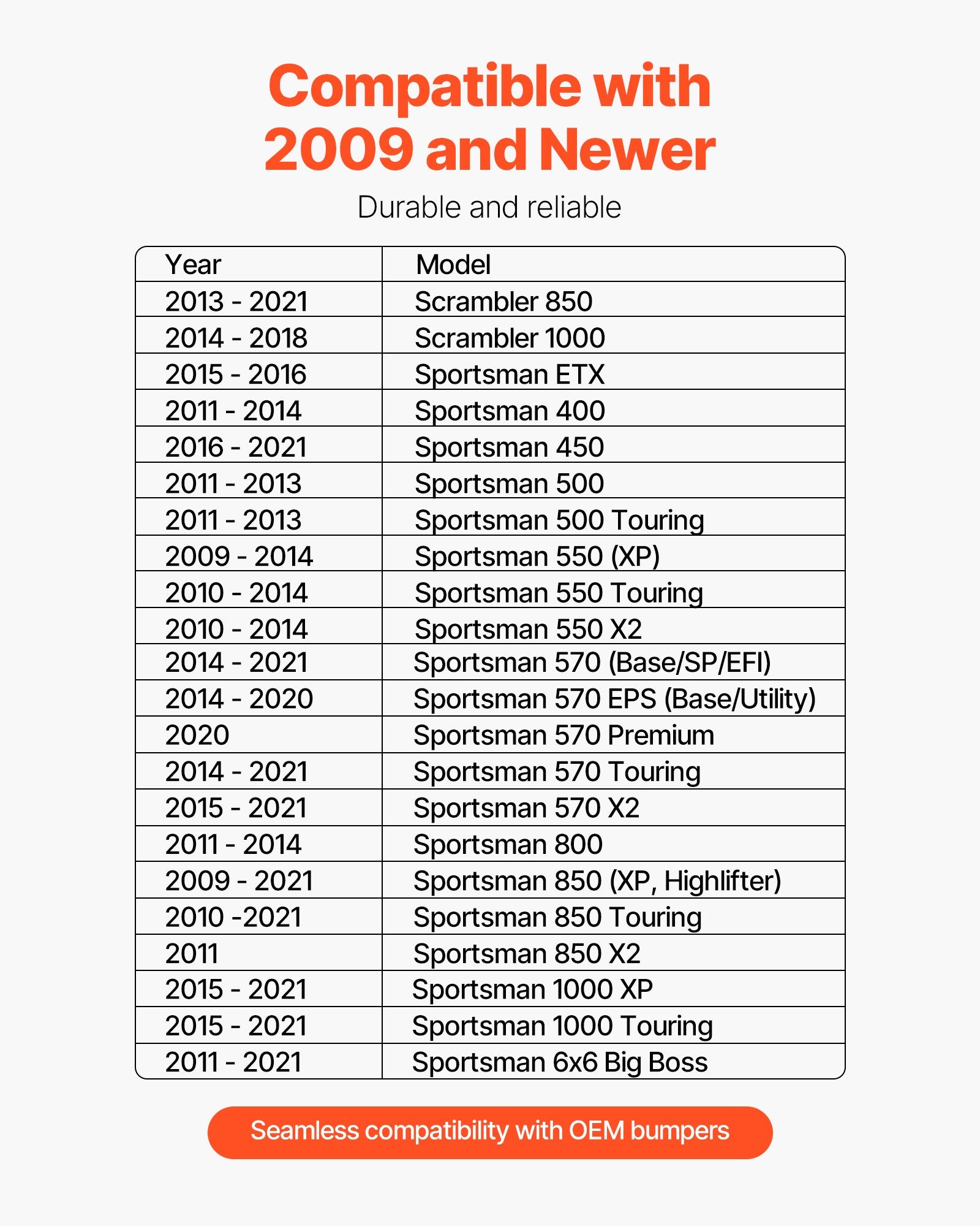 - Kompatibel med Polaris Sportsman-modeller: Vårt vinschdragfäste är specialdesignat för alla Polaris Sportsman-modeller från 2009 till nutid och är sömlöst kompatibelt med OEM-stötfångare. Inga ytterligare modifieringar eller borrning krävs, vilket ger en riktig plug-and-play-upplevelse.