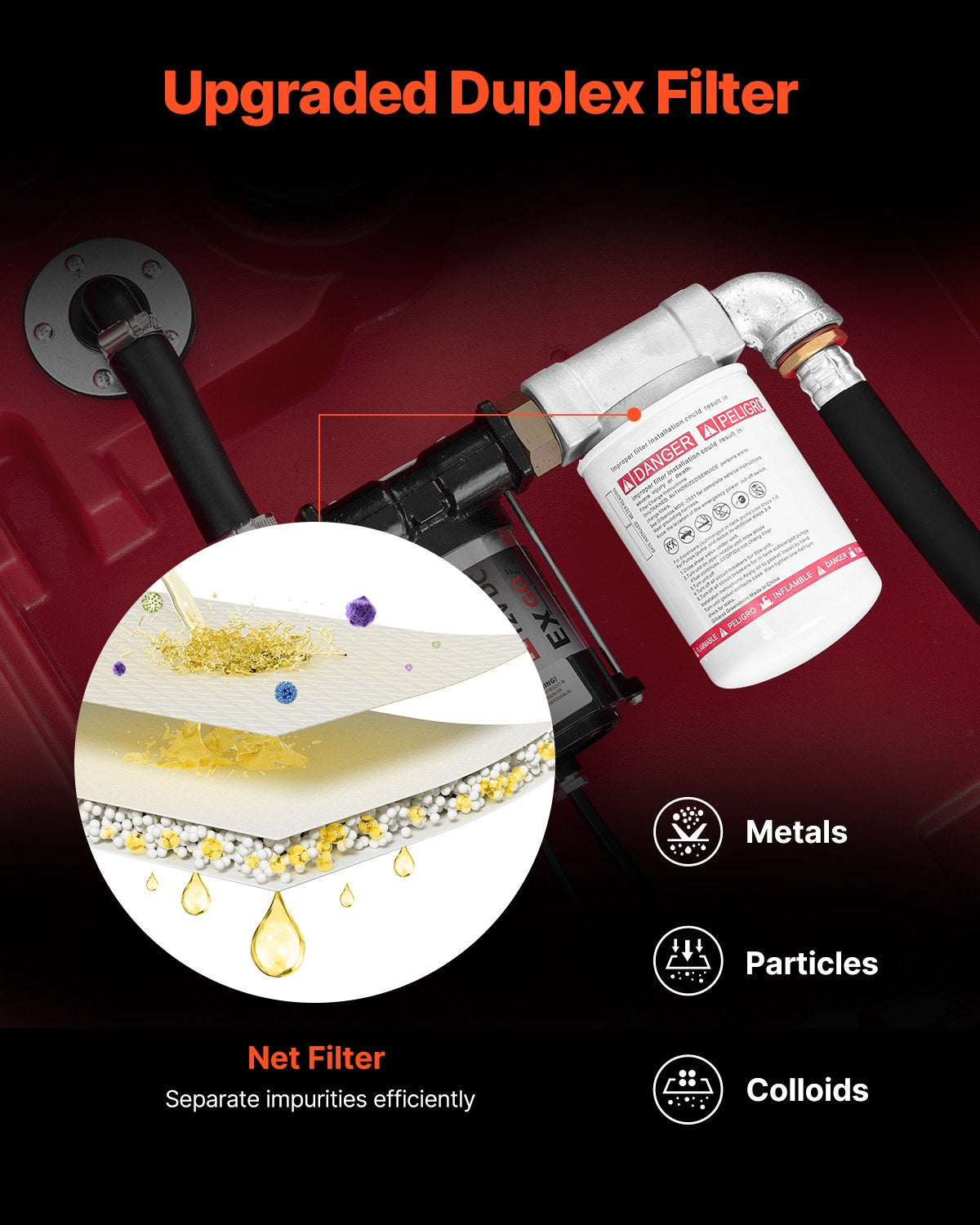 - Uppgraderad filterdesign: Jämfört med andra produkter är vår bränsletank utrustad med ett duplexfilter för att ge renare diesel. Det främre filtret på innertanken kan separera stora föroreningspartiklar, och det premiumyttre filtret är utformat för att filtrera bort små föroreningar som metall, kolloider, små partiklar etc.