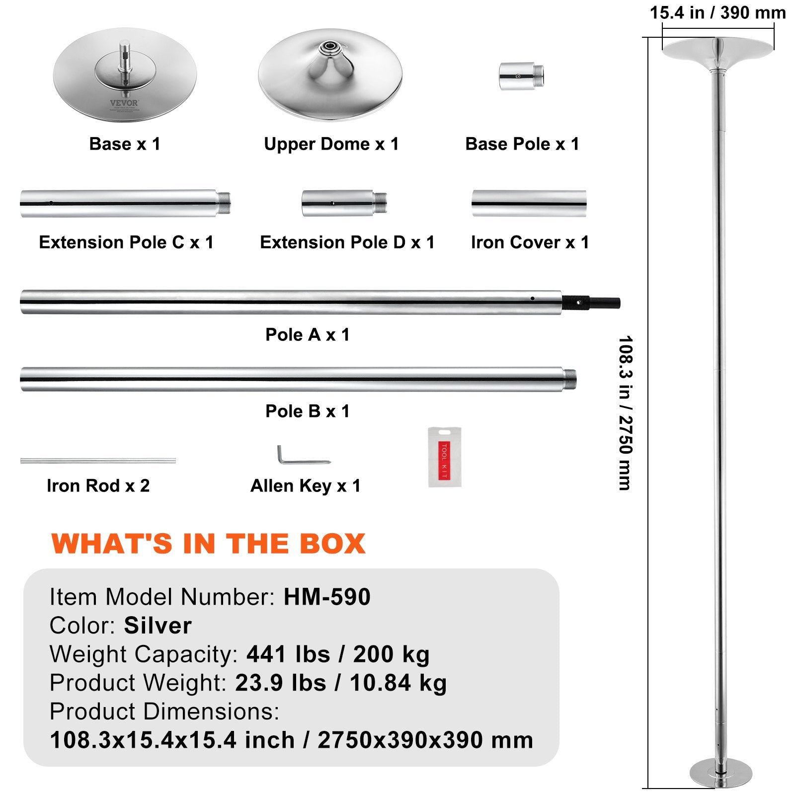 - Durable Material: The professional dancing pole is meticulously crafted from a standard 45mm steel pole with a thickness of 1.9mm, offering reliable safety and robustness. Maximum weight capacity: 200kg/441lbs. It features a powder-coated finish for rust and corrosion resistance, enhancing grip strength. Assembled dimensions: 108.3x15.4x15.4 inches / 2750x390x390 mm.