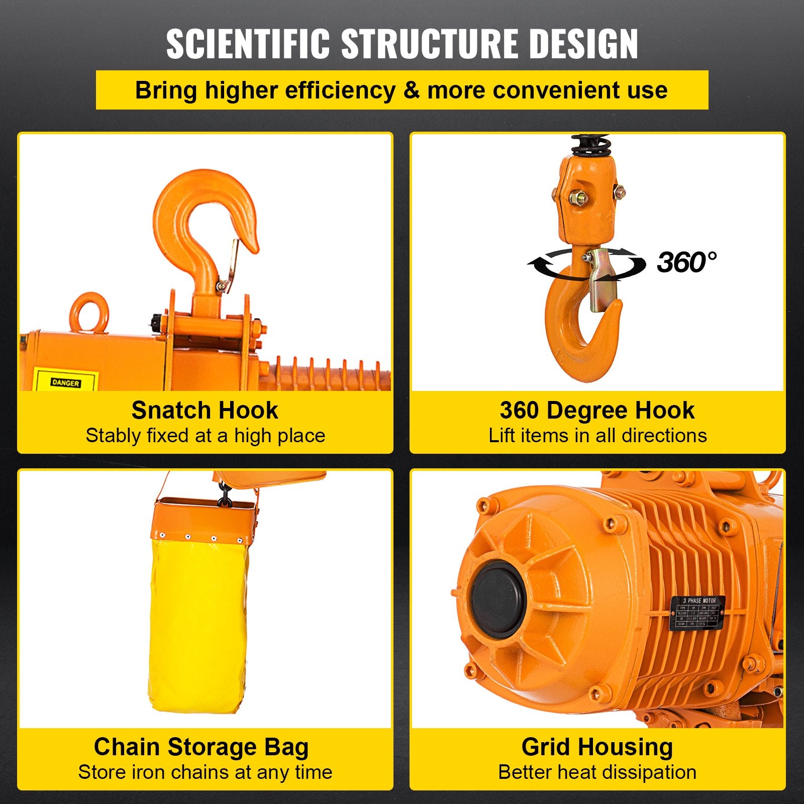 - Robust motor och hållbart hölje: Effekt: 1,1 kW. Vår elektriska kättingtelfer har en enfas kopparmotor och ett aluminiumhölje, vilket gör den hållbar, rostfri och korrosionsbeständig. Speciella kylflänsar säkerställer snabb kylning och hög arbetseffektivitet.