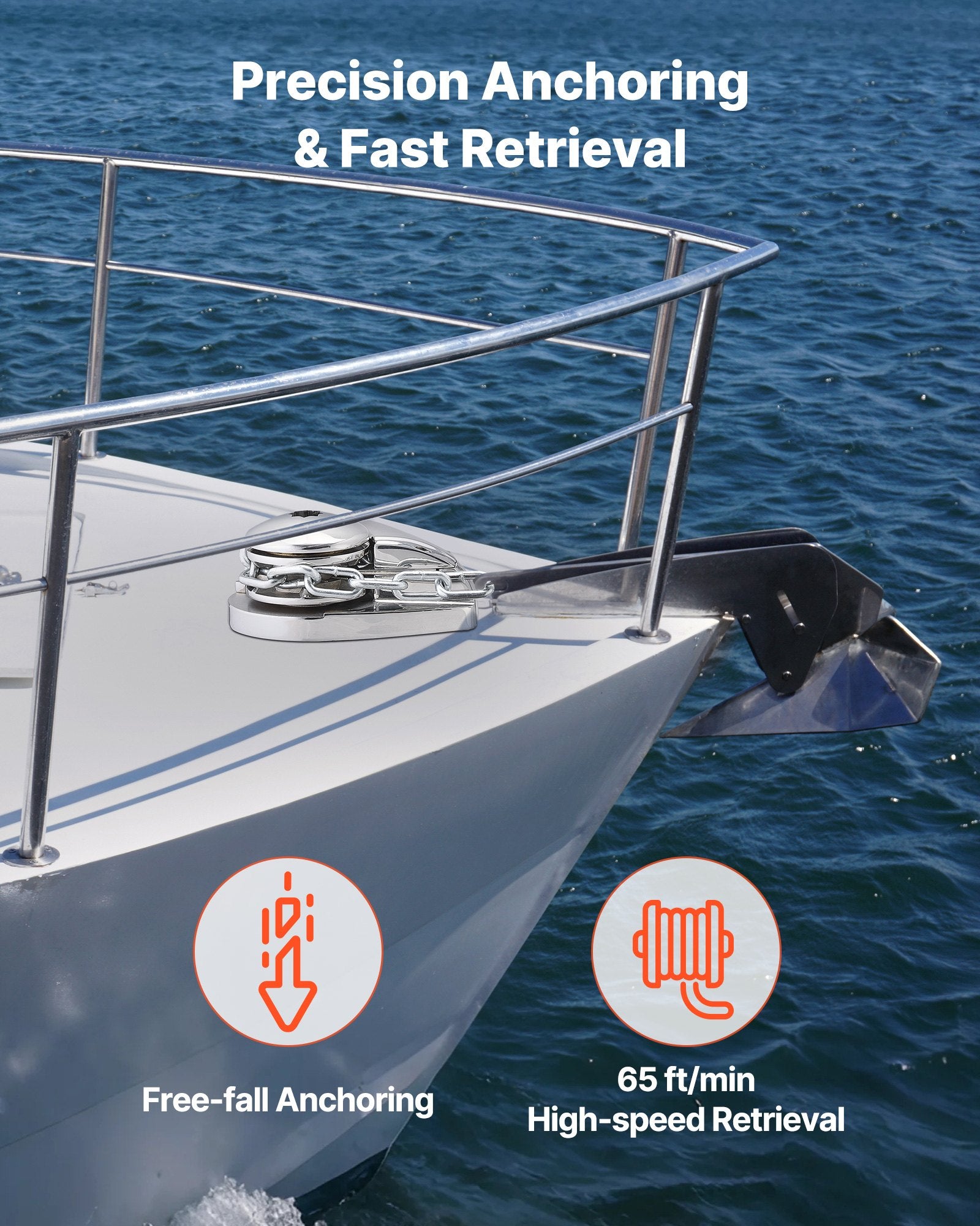 - Stark lastkapacitet: 600W kopparmotorn driver en arbetslast på 176 lbs. Båtens ankarspel håller kedjan stram, förhindrar glidning och säkerställer att varje ankringsjobb känns säkert och pålitligt.