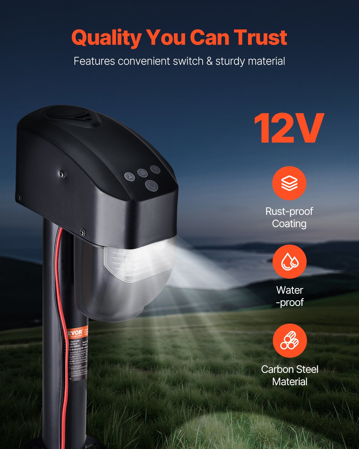 - Bekväm design: Fjärrkontroll för säkra, exakta och effektiva justeringar. Den inbyggda LED-lampan på vår elektriska släpvagnsdomkraft garanterar god sikt även vid användning i mörkret. Det medföljande solskyddet och det vattentäta skyddet säkrar domkraften och förlänger dess livslängd.