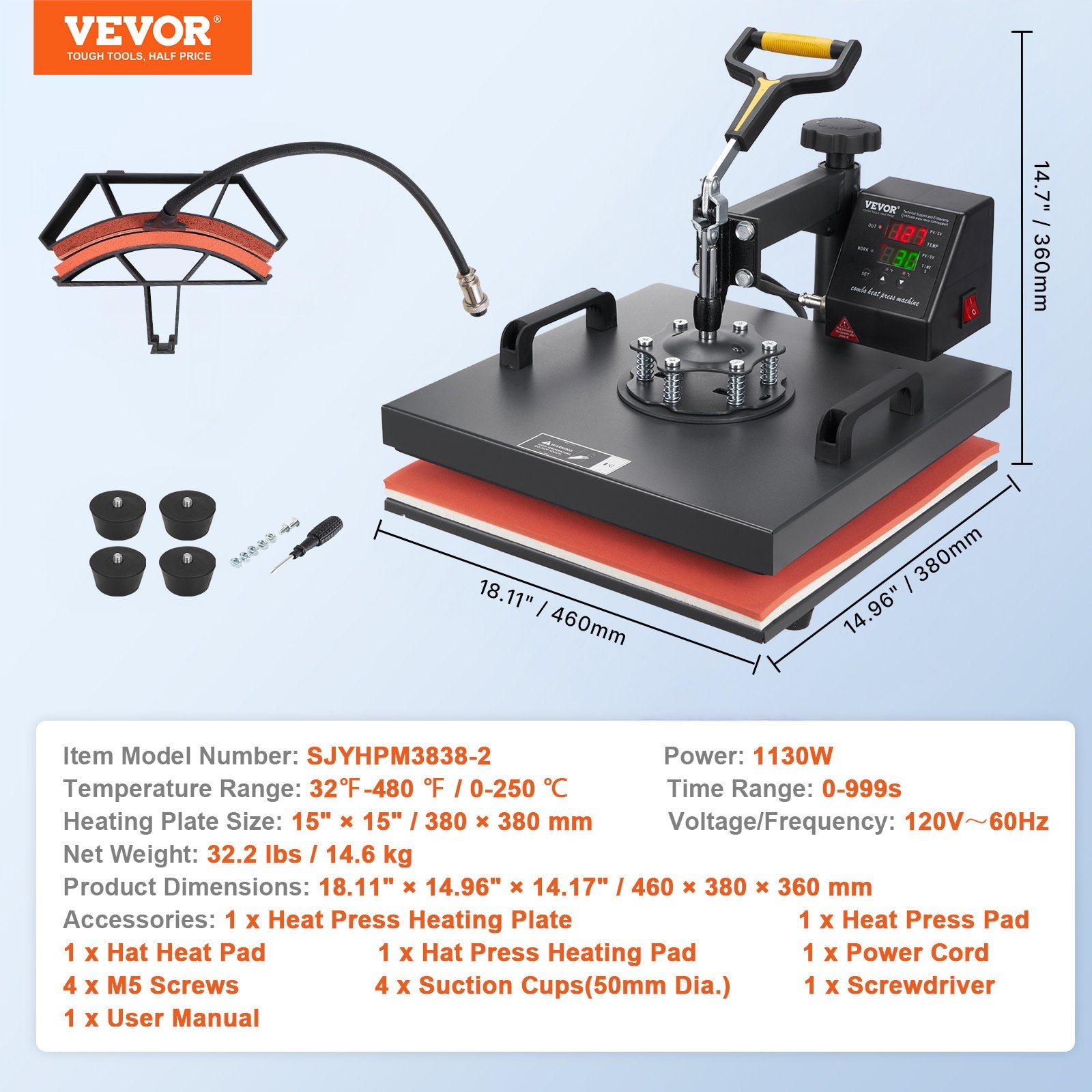 - Lätt att använda: VEVOR 2-i-1 sublimeringsmaskin är perfekt för att göra presenter till vänner och familj. Du kan skapa T-shirts, kuddar, väskor, telefonfodral, kepsar, hattar etc. Överför snabbt färgglada bilder och karaktärer till textilier som bomull, tyg, HTV, keramik, glas, tyger, lin, fiber, nylon etc. OBS: Denna produkt finns i två utföranden med samma funktion. Produkten levereras slumpmässigt.