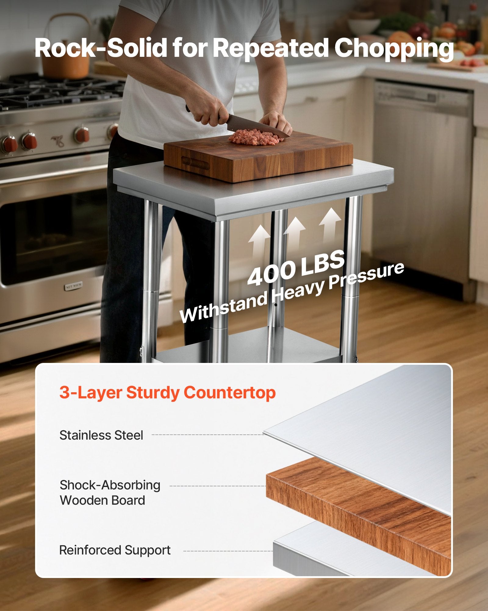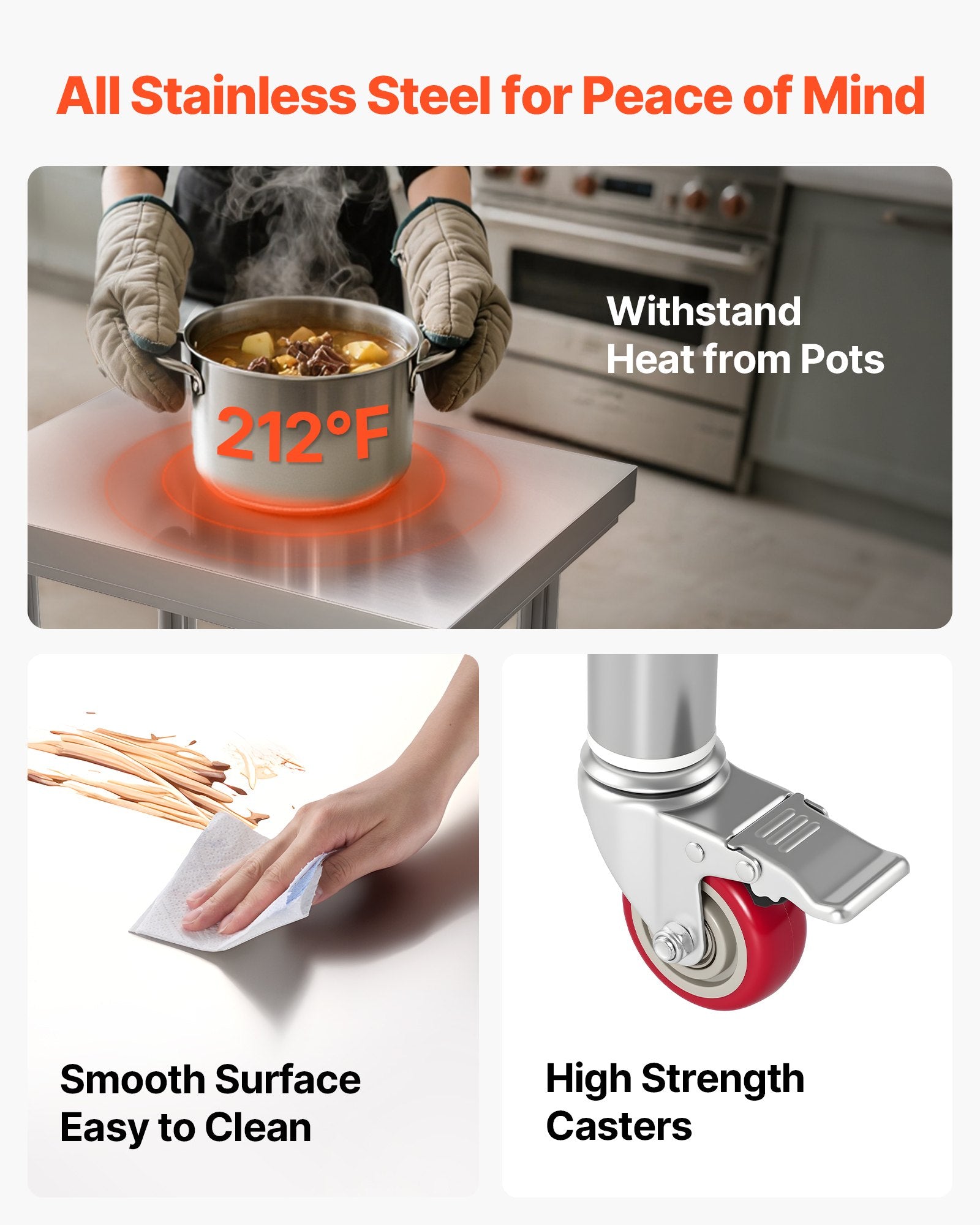 - Högkvalitativt rostfritt stål: Vårt arbetsbord i rostfritt stål, 61 x 43 x 89 cm, är tillverkat av SUS201 rostfritt stål för bordsskiva, hyllor och ben. Det är rostfritt, snyggt och enkelt att rengöra med en enkel torkning.