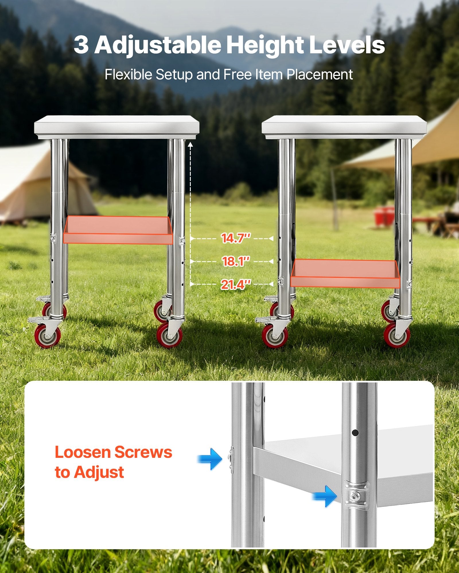 Bord i rostfritt stål, 61 x 45 cm arbetsbord för matlagning med hjul, köksbord med justerbara arbetsplatser under hyllplan för storkök, restaurang, hotell och garage, utomhus