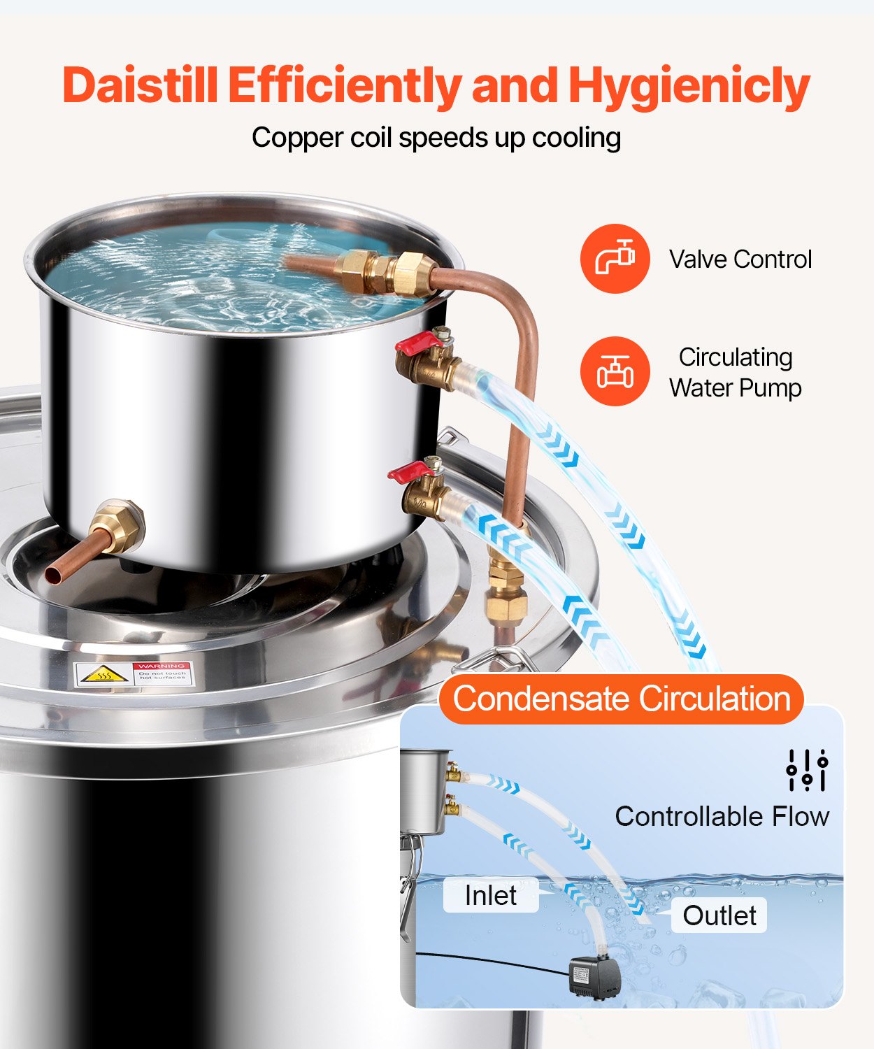 - Snabb och effektiv kylning: Kyl- och destillationsprocessen använder kopparrör med god värmeledningsförmåga för att accelerera kylningen. Den släta och skrynkelfria insidan av rören förhindrar rester av destillerad alkohol och vatten, vilket säkerställer ingen eftersmak. En vattenpump underlättar kylvattencirkulationen för grundlig och effektiv kylning.