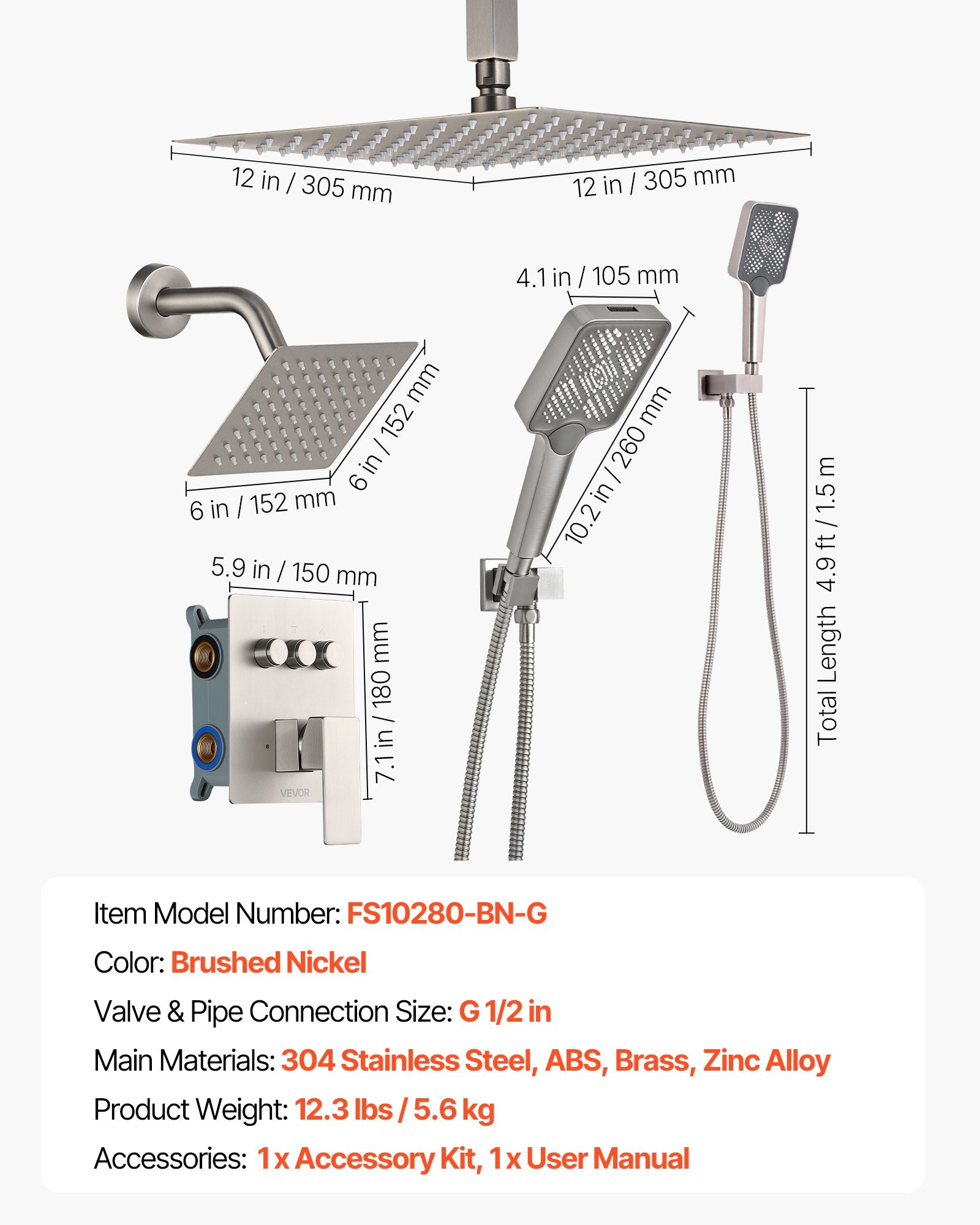 Duschblandareset, 305 mm takmonterat regnduschsystem med 152 mm väggmonterat huvud och 4-i-1 handdusch, roterbart 3-funktions dubbelt regnduschhuvud, mässingsventil och tillbehör, borstad nickel