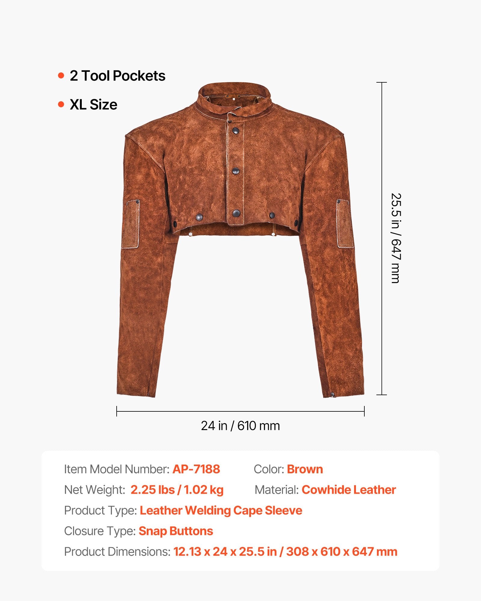 - Flambeständigt nötskinn: Tillverkat av kraftigt helnötskinn och sydd med stark, flambeständig kevlartråd. VEVOR svetsmantelhylsa garanterar hög hållbarhet och tillförlitligt skydd, vilket skyddar dig mot gnistor, lågor, värme och brandrisker.