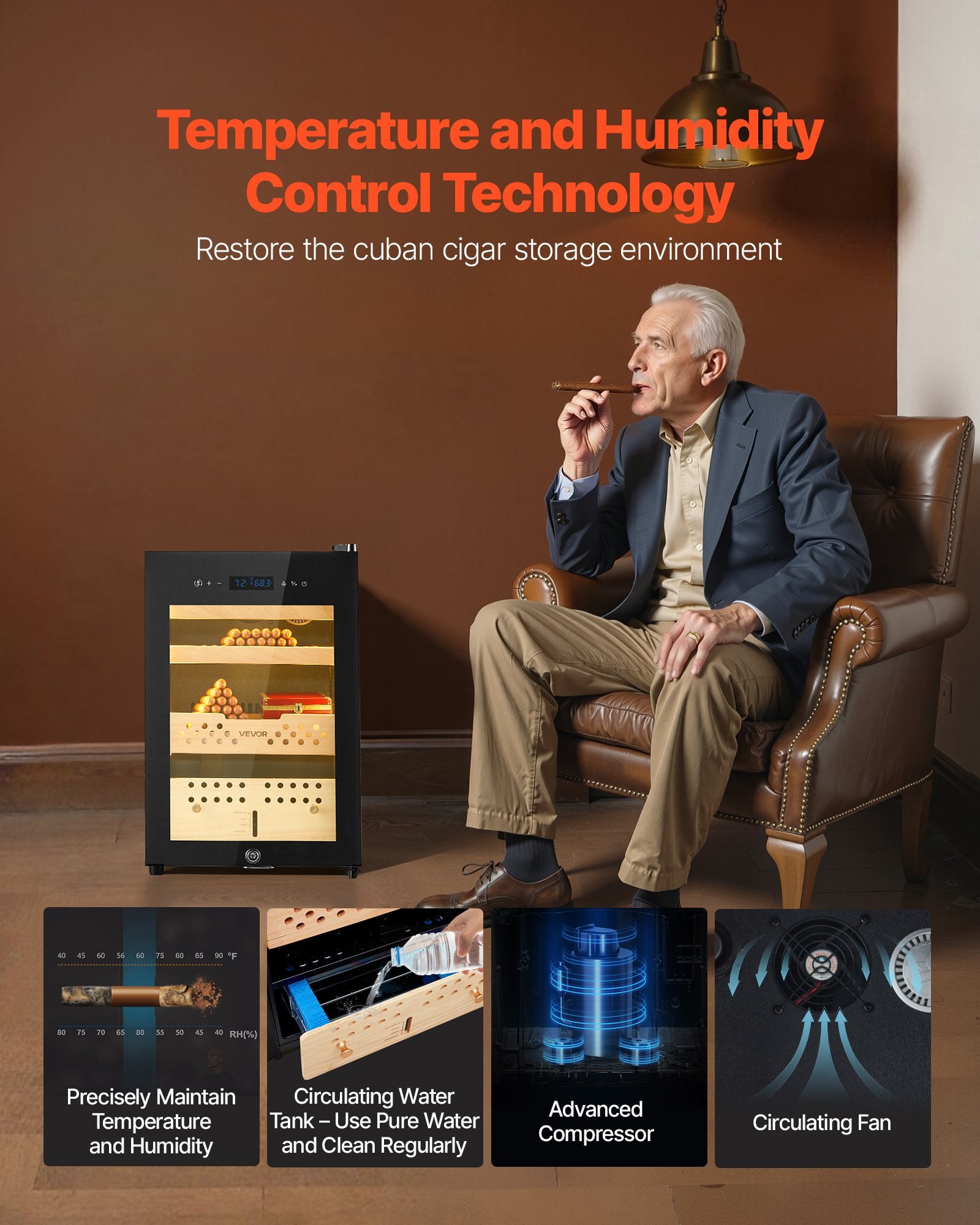- Konstant temperatur och luftfuktighet: Utrustad med en cirkulerande vattentank, högpresterande kompressor och cirkulerande fläkt, fördelar vår elektriska cigarrhumidor jämnt varm och kall luft, vilket håller dina cigarrer i optimal bevaring.