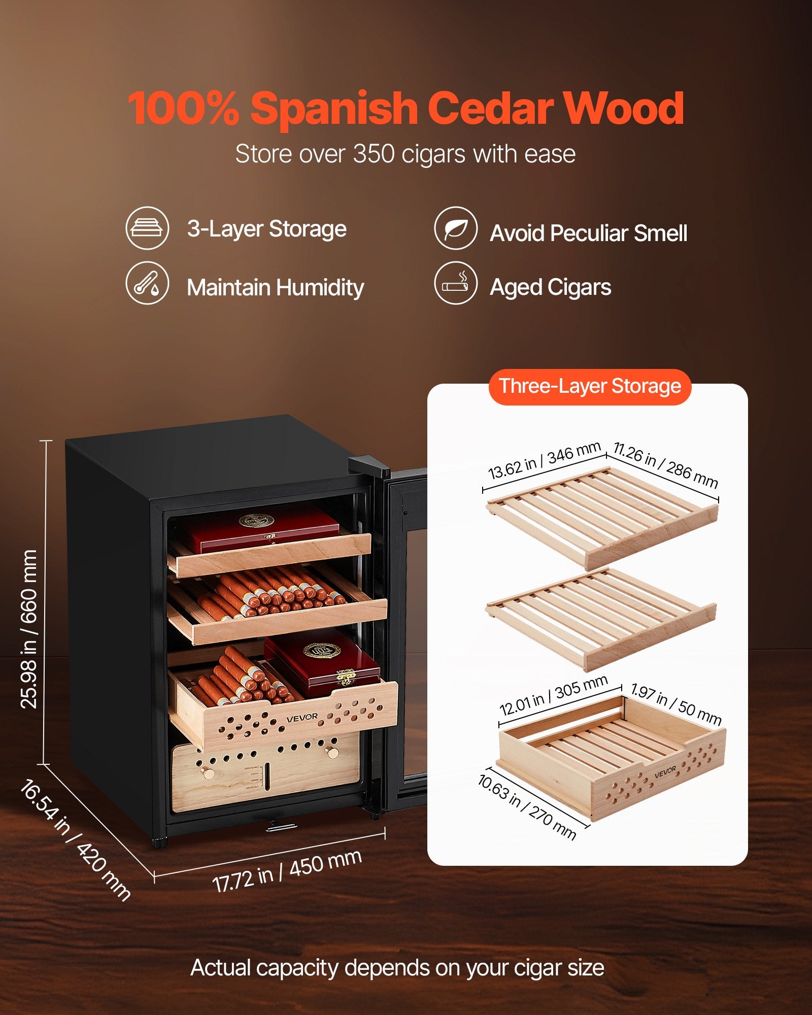 - Stor kapacitet för din cigarr: Tillverkad av 100 % spansk cederträ, avger den elektriska humidorn för cigarrer naturlig arom och neutraliserar lukter, vilket förhindrar att din cigarr torkar. Förvaring i tre lager rymmer upp till 350 cigarrer – den faktiska kapaciteten kan variera beroende på storlek.