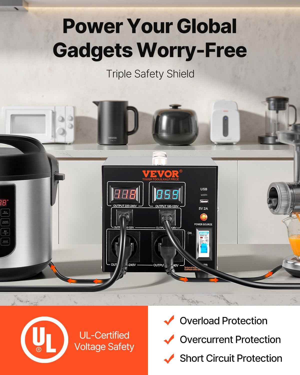 - 2000W spänningsomvandlare: Denna transformator med upp- och nerkoppling har 4 AC-kontakter, inklusive 2 amerikanska NEMA 5-15R 3-poliga utgångar, 2 europeiska Shucko-utgångar, 1 5V USB-port och 1 typ-C-uttag. Den är byggd med 2 LED-displayer som visar den aktuella utgångsspänningen i realtid för att undvika överbelastning av transformatorn.
