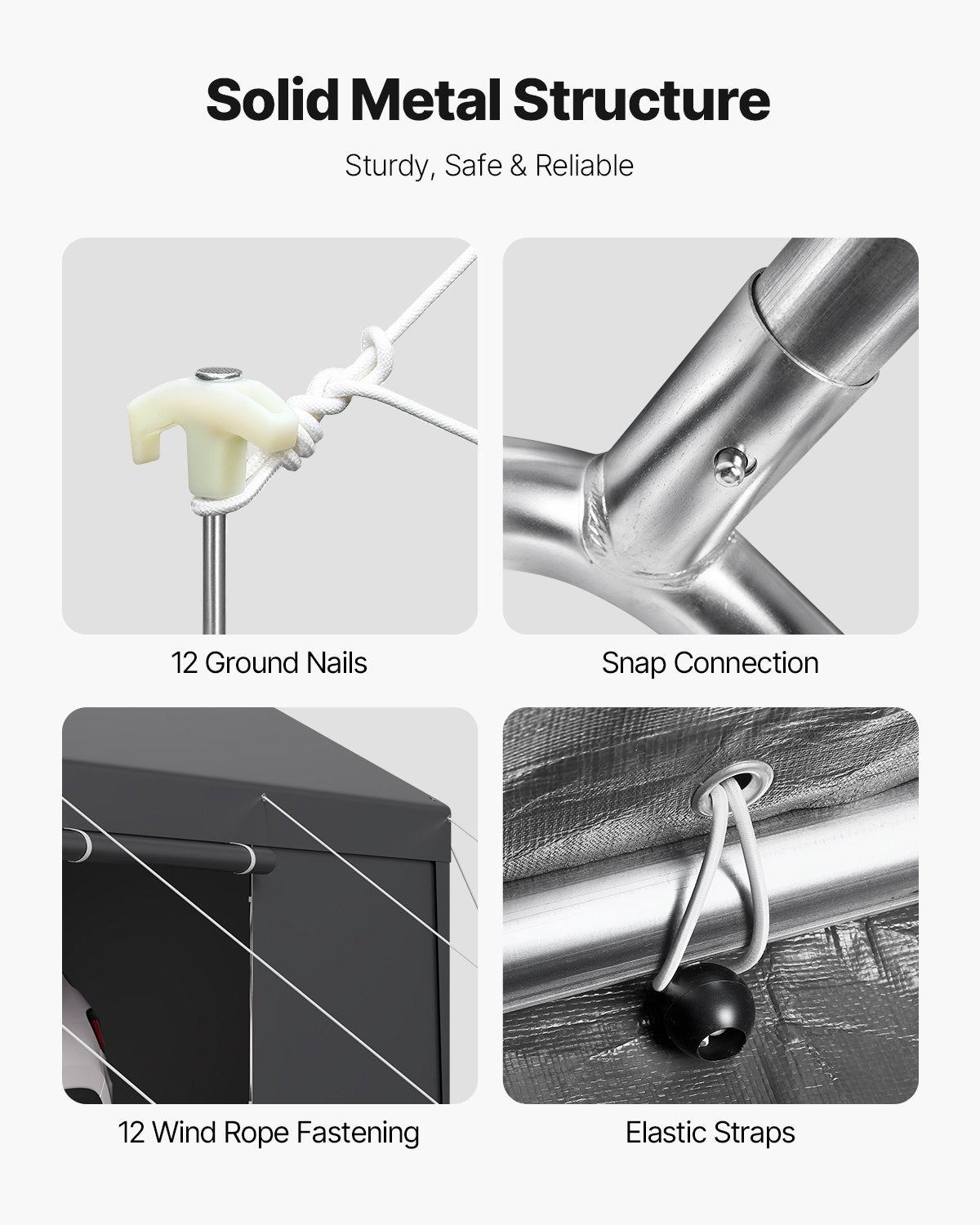 - Starka och hållbara material: Ramen är tillverkad av galvaniserade stålrör och motstår rost. Biltaket har en ram av legerat stål som är starkare och mer hållbar än vanligt stål, och kan motstå högre vindtryck och tyngre vikt, vilket garanterar långvarig användning. Utrustad med vindlinor och markstag för ökad stabilitet i blåsiga förhållanden.