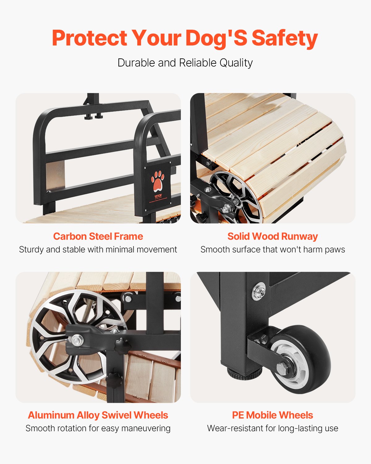- Sturdy and Durable Structure: Built with a robust carbon steel frame for stability, our dog running machine features a smooth wooden track that won’t harm your dog’s paws. The aluminum rollers provide high-intensity training safety, and two wheels allow for easy movement.