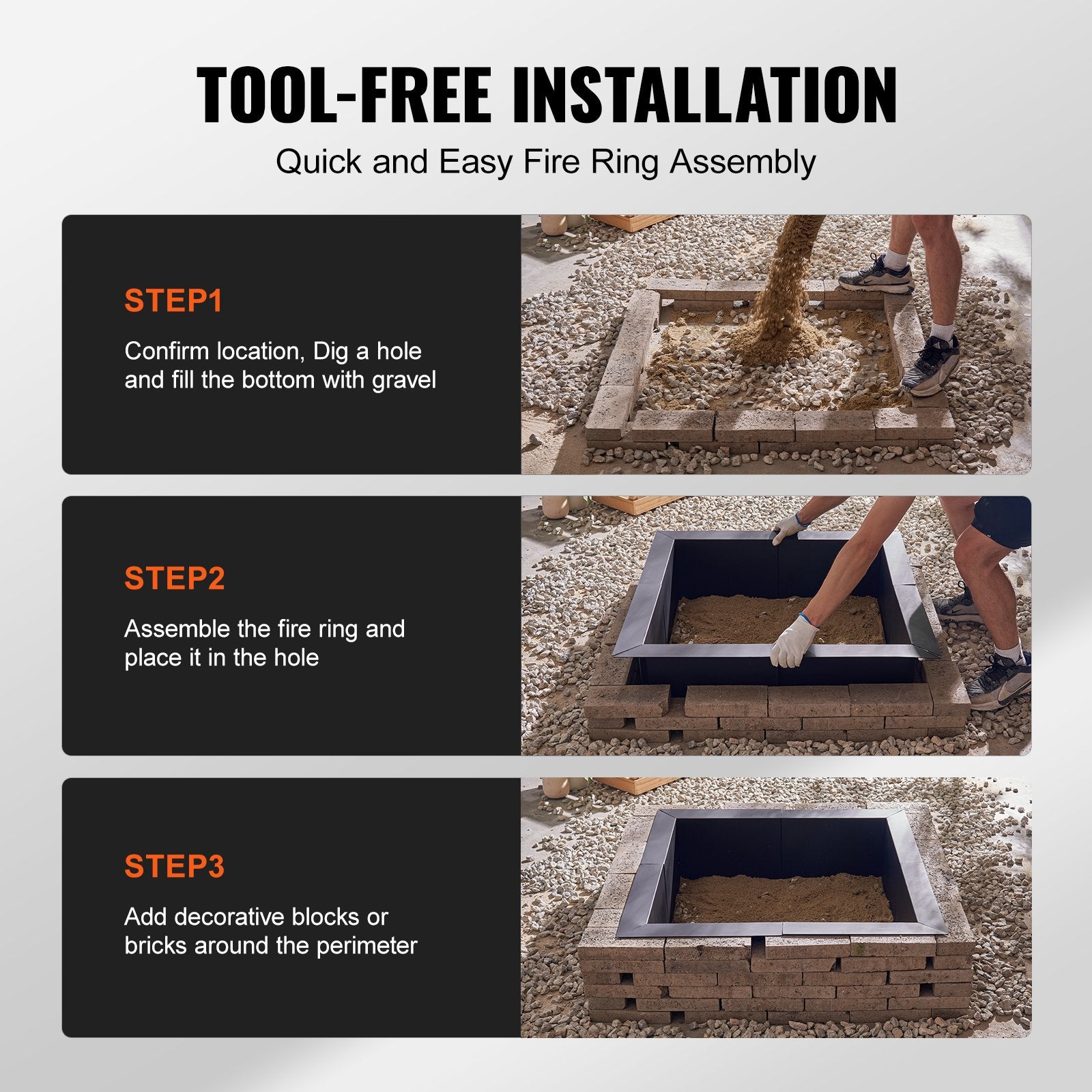 Eldgropsring, 36x36 tum ytterdiameter/30x30 tum innerdiameter, 10 tum hög fyrkantig eldgropinsats, kraftigt foder i kolstål, gör-det-själv-lägereldsring ovanför eller i marken, för utomhuscamping, brasor